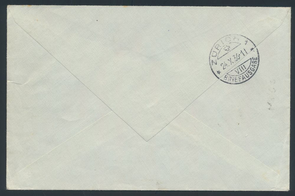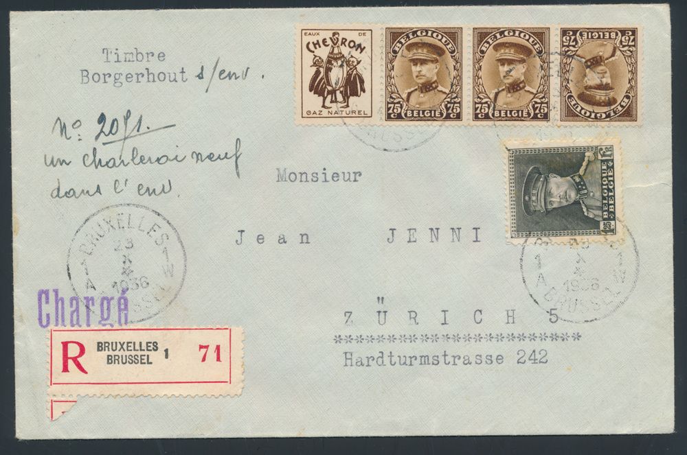 2460 imagePU 67, KP15 and N° 318, on registered envelope, afst. Bruxelles-Brussels, dd. 23 X 36, to Zurich (Switzerland), nice charge cancellation in purple, vf.(Image 1) (Image 2)