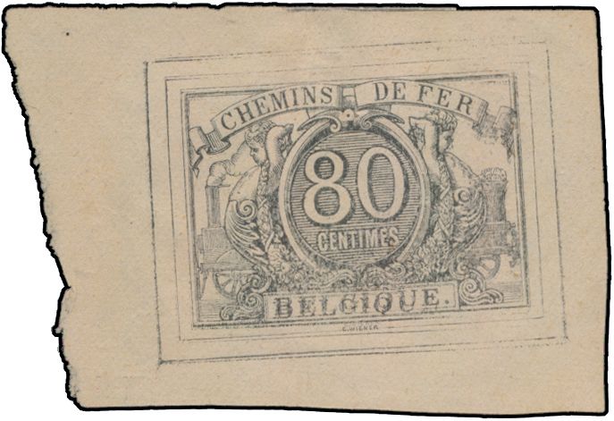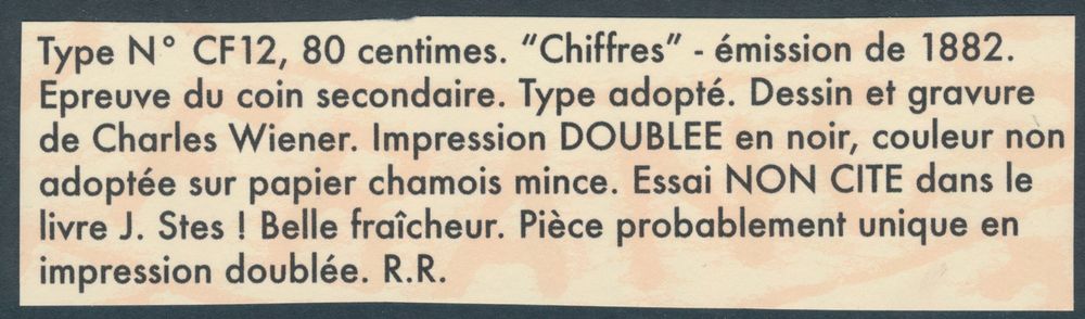 2484 imageTR 12 "80c.", "Chiffres", 1882 issue, proof * of mould, unadopted design, drawing and engraving by Charles Wiener, doubled offset "Impression double" in black, unadopted colour on thin Chamois paper, this proof is not mentioned in Dr J. Stes' book, very fresh item, probably unique copy for the "Impression double", R.R., vf - see photo cover(Image 1) (Image 2)