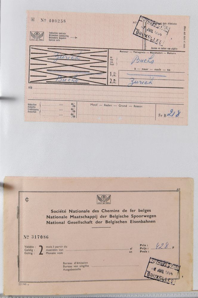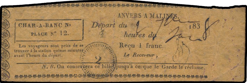2582 image1838 Train ticket of the Anvers-Malines line, dated 2 June 1838, signed by the recipient applying a tampon "2", attached to the document is a unique letter to Mr Herlant, which states: 1. "Timbre avec marque CUPERUS", 2. "Photocopy d'un ticket de 1838 avec marque au tampon" (with drawing), 3. "la carte de 1885 des Ch. d. G. Nota : un carte pour les télégraphes doit être au musée Postal", vf(Image 1) (All Images)
