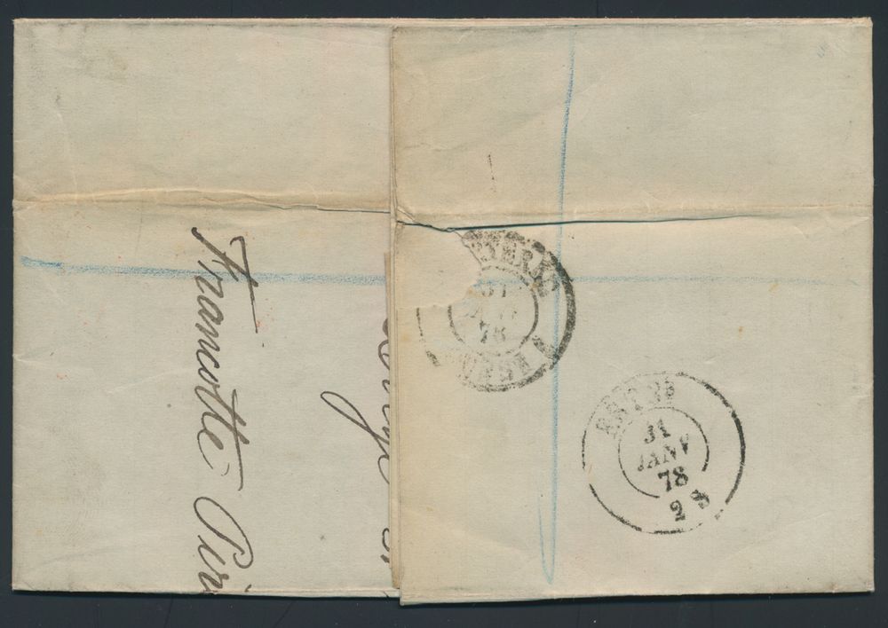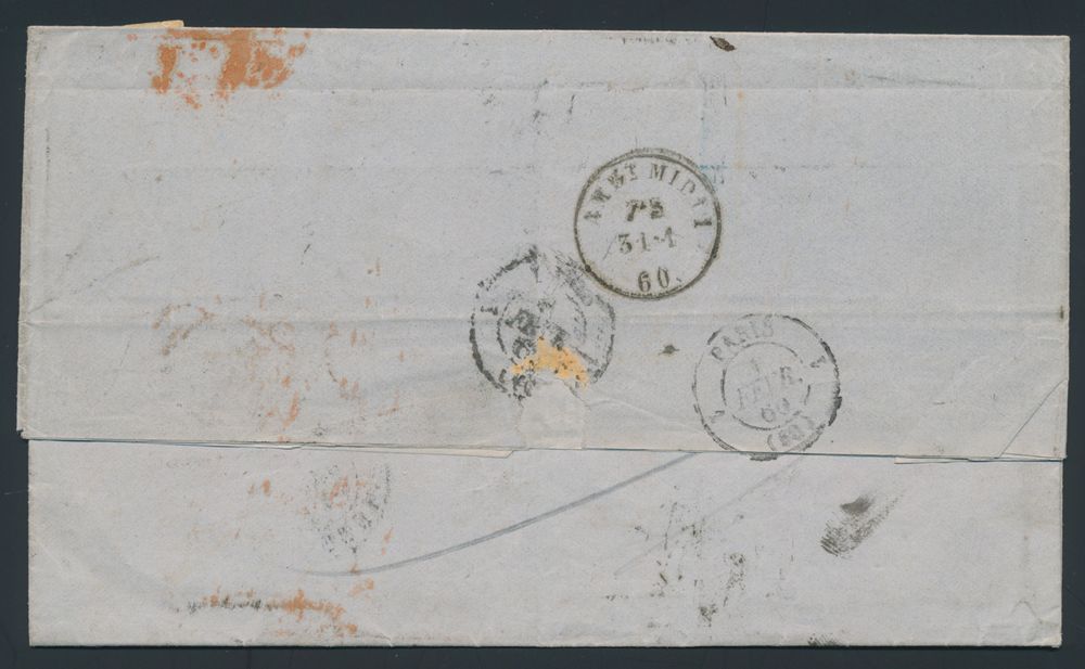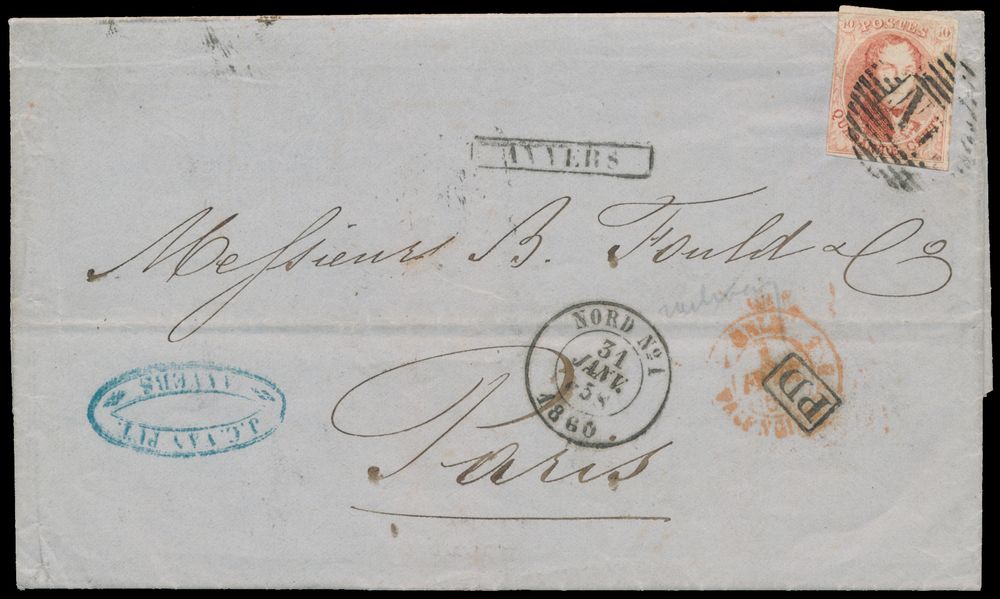 2588 image1860 Nord N° 1, letter with contents, N° 12A (fully margined) with ambulantory barred stamp "N.I" and departure stamp "Nord N° 1", origin Antwerp ("Anvers" in frame black), dated 31 January 1860 to Paris (France), on reverse several cancellations including "Ambt MIDI 1", "PD" in frame black, vf(Image 1) (Image 2)