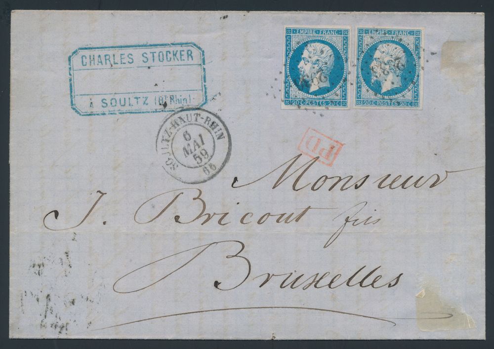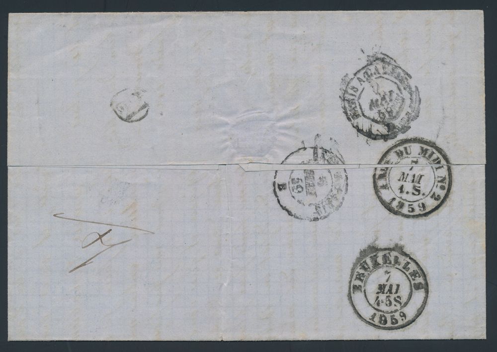 2586 image1859 Ambt. Du Midi N° 2, letter with half content, from Soultz-Haut-Rhin, with French stamp Yv. n° 14A (2x), dotted cancel 2936, dated 6 May 1859, to Bruxelles, (half) content of letter was written from Bruxelles on 8 May (probably the reply), several cancellations on reverse, including a beautiful ambulantory stamp of "Ambt. DU MIDI N° 2", "PD "in frame red, vf.(Image 1) (Image 2)