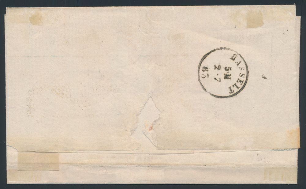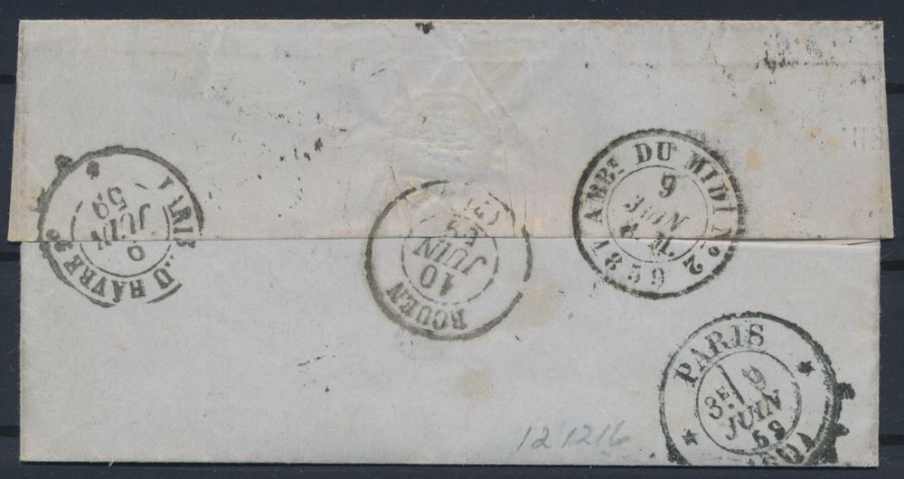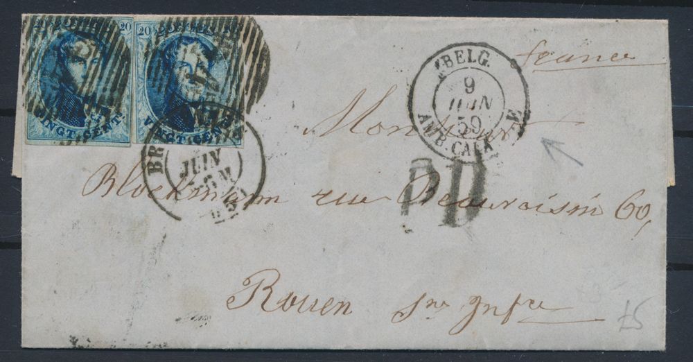 2587 image1859 Ambt. Du Midi N° 2, letter without content, from Bruxelles, with N° 11A (2x), cancelled P.24-Brussels, dated 9 June 1859, to Rouen (France), several cancellations on reverse, including a beautiful ambulantory cancellation of "Ambt. DU MIDI N°2", "PD" in black, large letters in italics, vf.(Image 1) (Image 2)