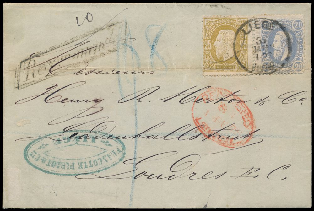 2597 image1878 Est N° 3b, registered letter with contents, from Liege, dated 31 December 1878, to London, with N° 31 and 32 (one cancel for both stamps), on the reverse, cancelled "Est. 3b" (Brussels-Verviers) and "Angleterre Ouest 2", beautiful oval red cancellation of "London registered", vf.(Image 1) (Image 2)