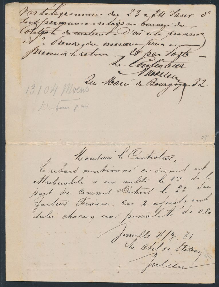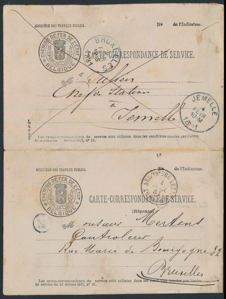 2598 image1881 Double card "Carte-Correspondance de Service" from Ministry of Public Works, cancelled "Chemin de Fer de l'État Belgique, grands sceaux", from Bruxelles dated 4 Feb 1881, sent to Jemmelle, vf(Image 1) (Image 2)