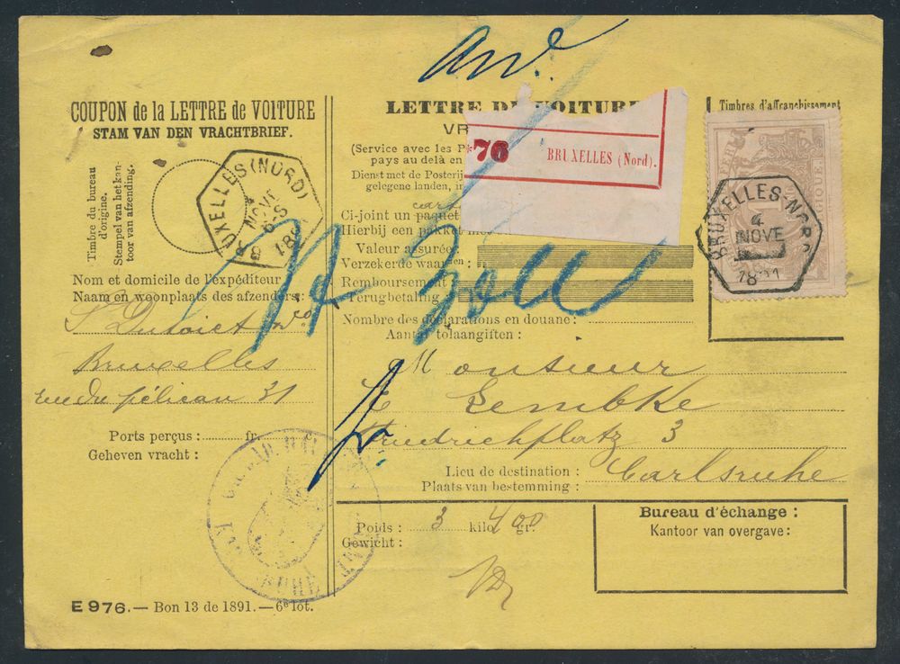2599 image1881 Lettre de voiture - Vrachtbrief E. 976 - Service avec les postes de l'Empire Germanique..., French and Dutch, franked TR 13 with cancel Bruxelles (Nord), dated 4 November 1881, to Karlsruhe, vf(Image 1) (All Images)