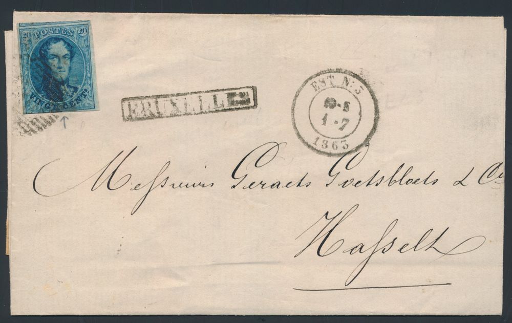 2592 image1863 Est N° 3, letter without content, N° 11 with cancel "EIII" and departure stamp "Est N° 3", from Bruxelles (name stamp black in frame), dated 1 July 1863, to Hasselt, vf(Image 1) (Image 2)