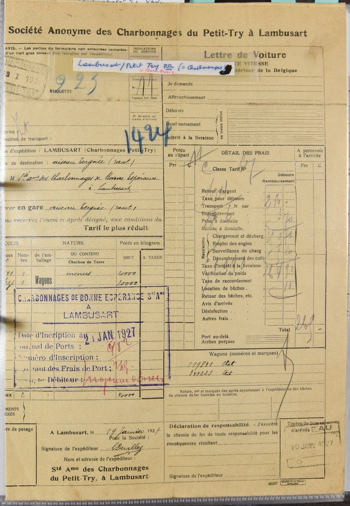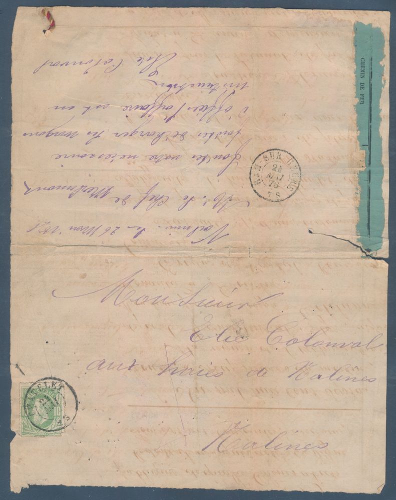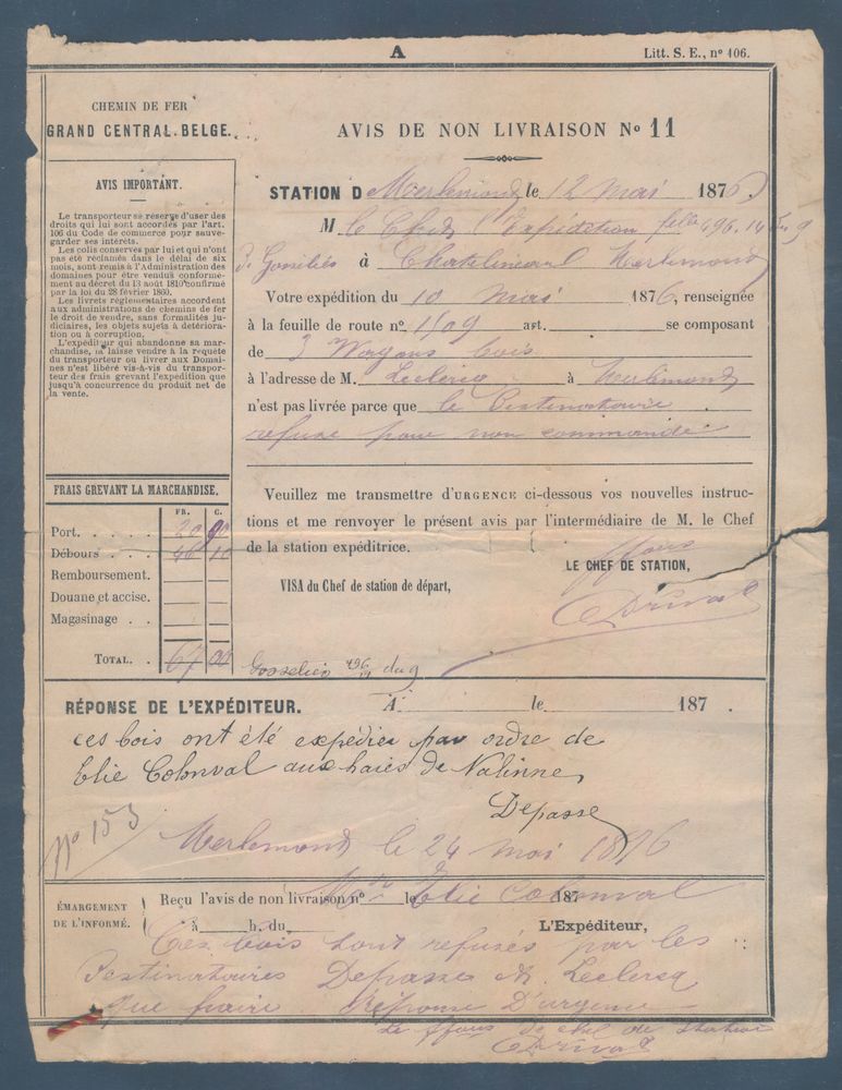 2596 image1876 Chemin de Fer - Grand Central Belge, document number 106, "Avis de non Livraison", Herbemont, dated 12 May 1876. N° 30, "10c green", cancel "Châtelet", dated 24 May 1876, vf/f.(Image 1) (Image 2)