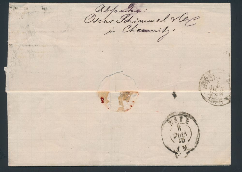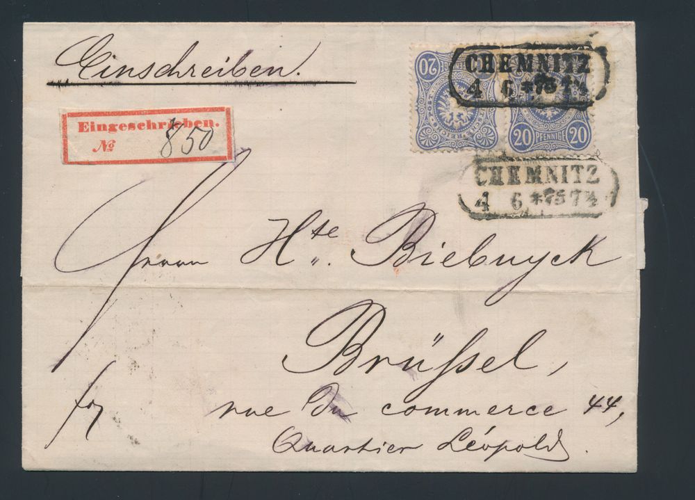 2595 image1875 Est n° 2, registered letter without contents, from Chemnitz (Germany), franked on 4 June 1875, franked with 2 times "20 pfenning" to Germany, on arrival at the border, the arrival postmark of "Est 2" is applied, vf(Image 1) (Image 2)