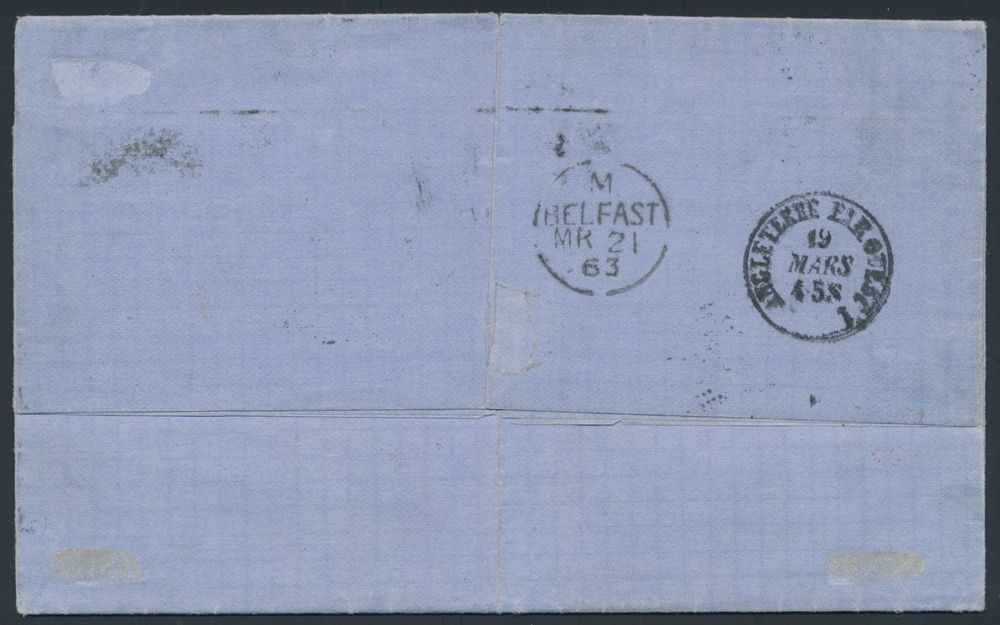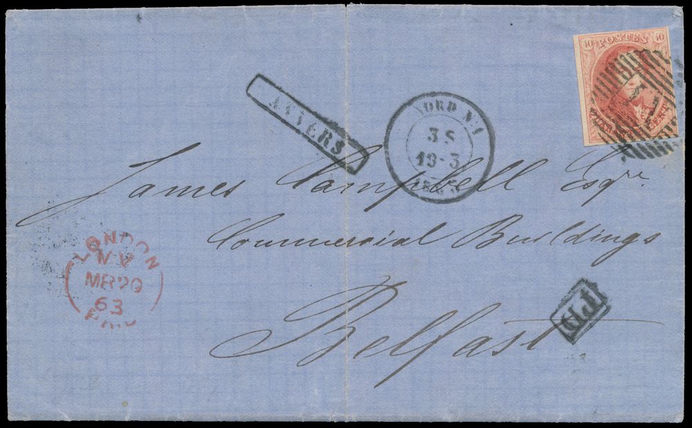2591 image1863 Nord N° 1, letter with contents, N° 12 (fully margined) with ambulantory barred stamp "N.I" and arrival postmark "Nord N° 1", origin Antwerp ("Anvers" in frame black), dated 19 March 1863 to Belfast (England), on reverse stamped "Angleterre par Ouest 1 and arrival postmark "Belfast", "PD" in frame black, vf(Image 1) (Image 2)