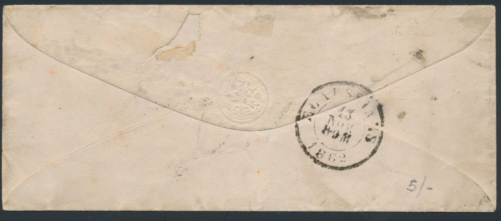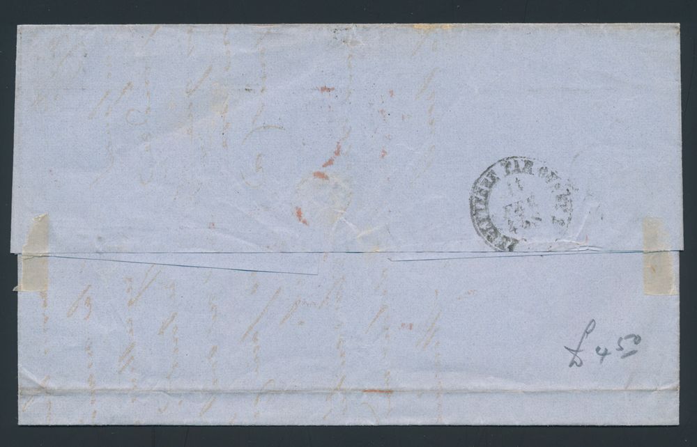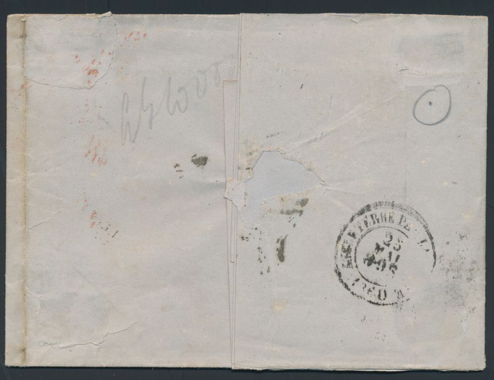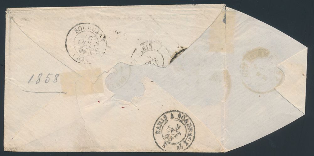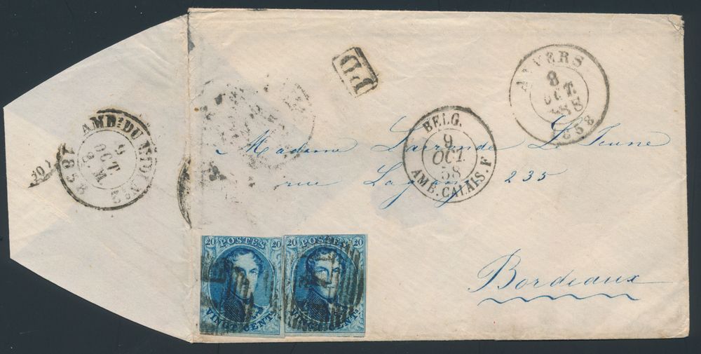 2585 image1858 Ambt. Du Midi N° 2, letter envelope, from Anvers, with N° 11A (2x), cancelled P.4-Anvers, dated 8 October 1858, to Bordeaux (France), several cancellations on reverse, including a beautiful ambulantory cancellation of "Ambt. DU MIDI N° 2", "PD" in box black, vf.(Image 1) (Image 2)