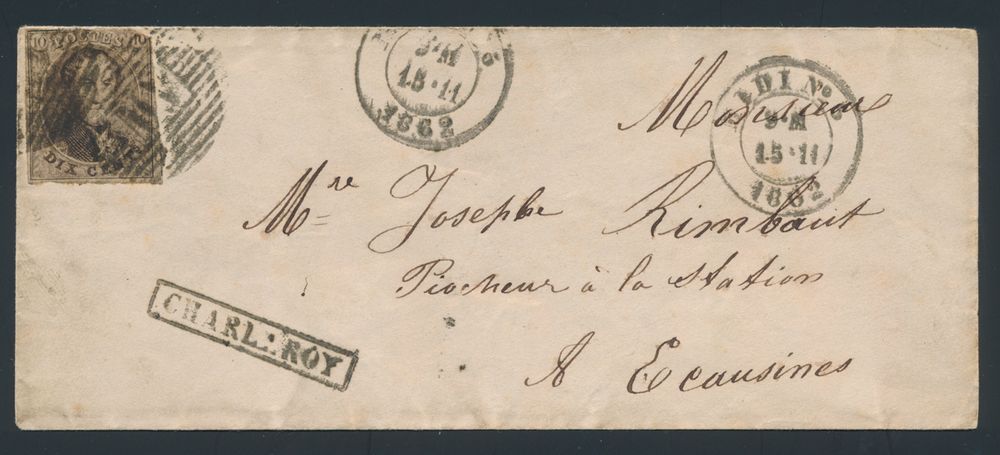 2590 image1862 MIDI V, on cover, from "Charleroy" (name stamp in frame black), N° 10 cancelled with "M.V.", dated 15 November 1862, to Ecaussines, vf(Image 1) (Image 2)