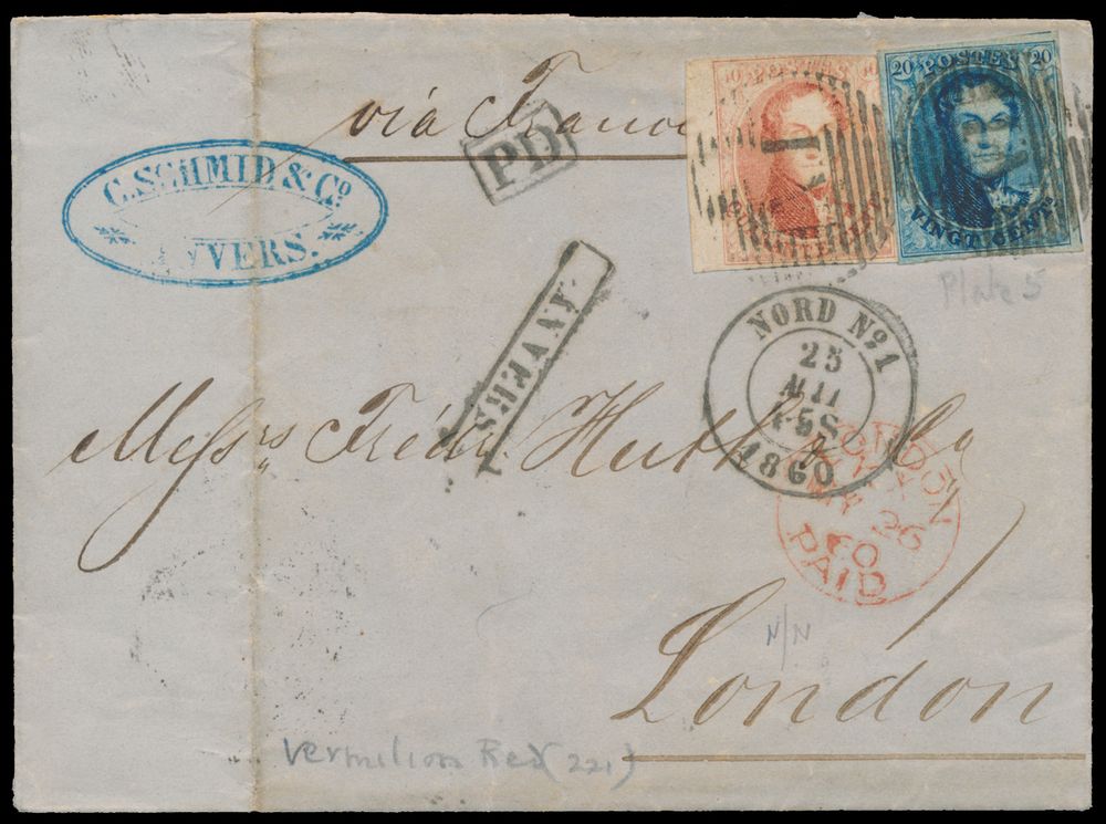 2589 image1860 Nord N°1, letter with contents, N° 12A (barred) and N° 11A (fully margined) with ambulantory bar stamp "N.I" and departure stamp "Nord N° 1", origin Antwerp ("Anvers" in frame black), dated 25 May 1860 to London (England), nice manuscript on front "via France", "PD" in frame black, vf(Image 1) (Image 2)