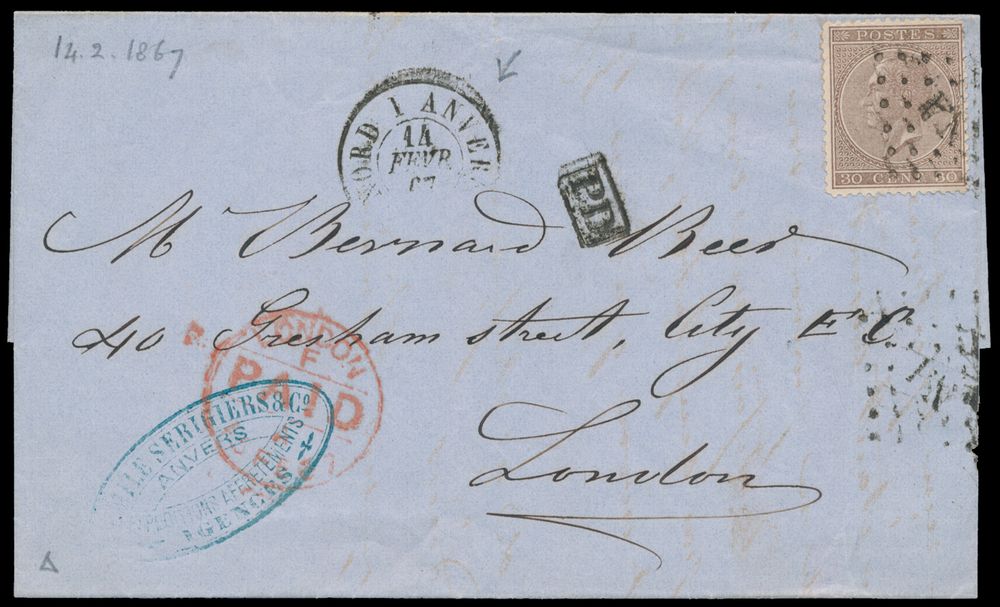 2593 image1867 Angleterre par Ouest 1 and Nord I Anvers, letter without contents, with N° 19, cancelled "N.1", from Anvers, dated 14 February 1867, to London (England), dotted cancel and "Nord I Anvers" was affixed at Antwerp (Antwerp-Brussels line) and cancelled at Brussels with "Angleterre par Ouest 1" to Ostend, nice letter, vf(Image 1) (Image 2)