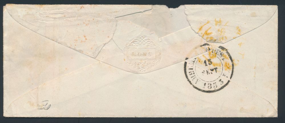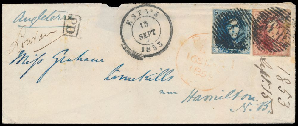 2584 image1853 Est N° 3, letter cover franked N° 7 and 8 (Total: "60c."), cancelled with E.II, dated 15 September 1853, to Hamilton (England), very nice departure stamp of Est N° 3 on the front together with manuscript of departure "Louvain", on the reverse ambulant stamp "Ambulant Ouest N°1", "PD" in box black, vf(Image 1) (Image 2)