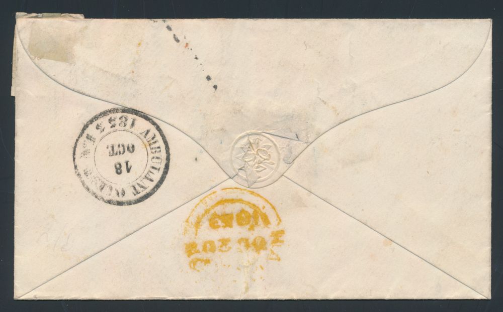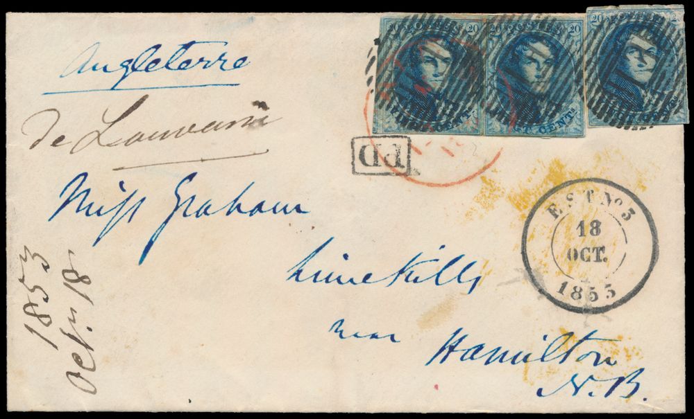2583 image1853 Est N° 3, letter envelope franked 3x n° 7 (total "60c."), cancelled with E.II, dated 18 October 1853, to Hamilton (England), very nice departure stamp of Est N° 3 on the front together with manuscript of departure "De Louvain", on the reverse ambulantory stamp "Ambulantory Ouest N° 1" and arrival postmark "Hamilton", "PD" in box black, vf(Image 1) (Image 2)