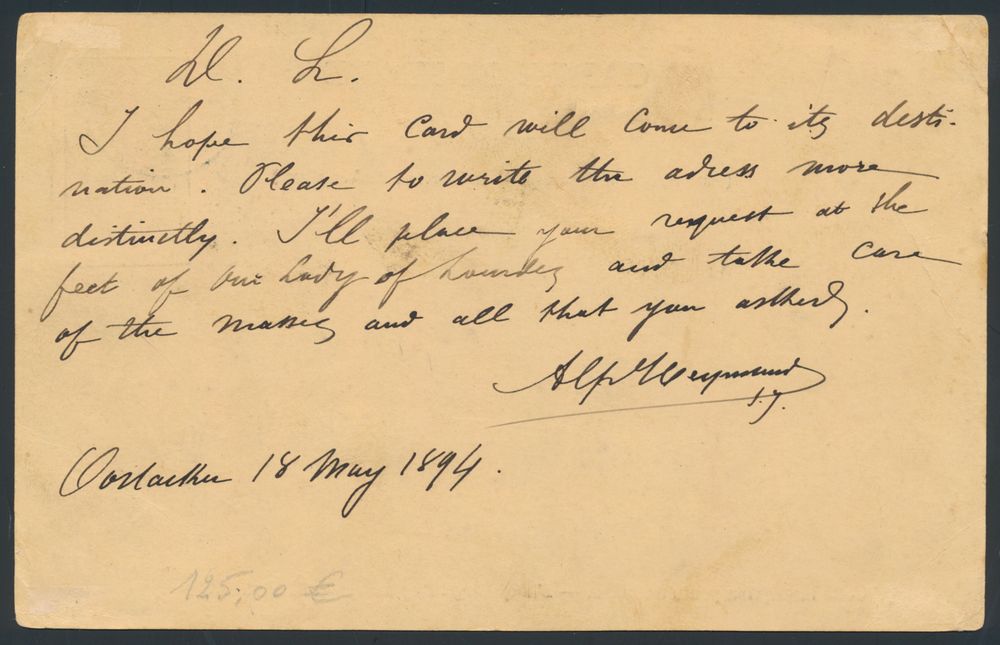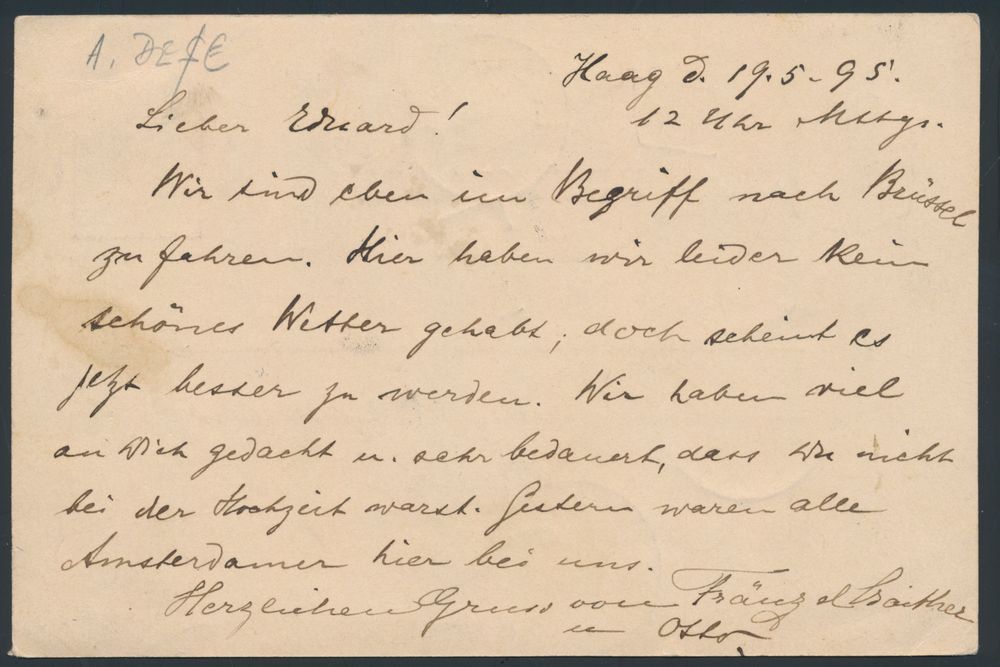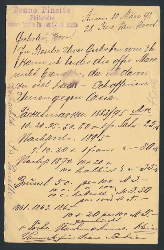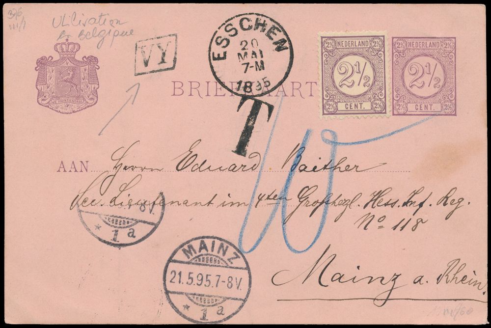 2730 PWST imagePWST, Dutch PWST of 2 1/2 cents, extra franked with YV. 33, "2 1/2 cents", sent from Belgium, Esschen (Essen - on the Dutch border), dated 20 May 1895, to Mainz a. Rhein, dated 21 May 1895. PO Box VY in black parallelogram. Postcard was rate valued in Germany. Irregular cancel, vf.(Image 1) (Image 2)