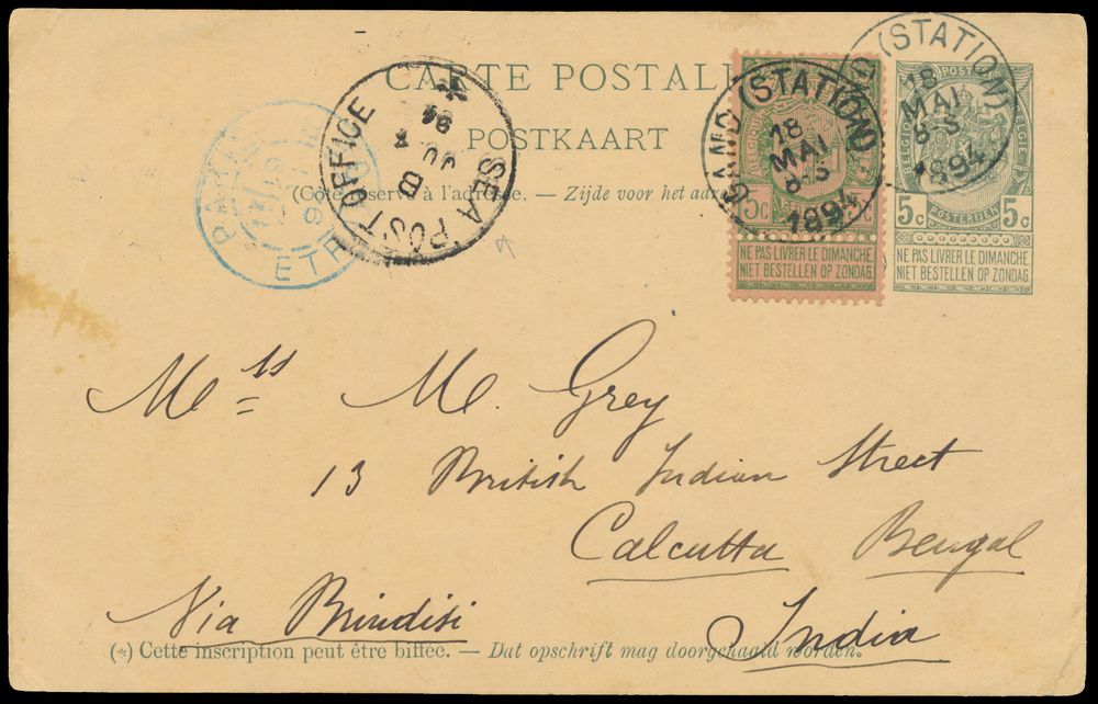2729 PWST image1894 N° 23 "5c. green" with additional stamp n° 68 "5c. green on light pink", cancelled in Ghent with "GAND" (station), dated 18 May 1894, to Calcutta (India), nice transit stamp "Paris Etranger" and manuscript "Via Brindisi" (Italy), side stamp "Sea Post Office", dated 4 June 1894, rare, vf(Image 1) (Image 2)