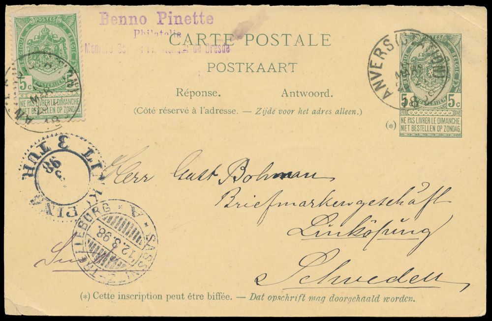 2731 PWST image1898 N° 23, with additional franking of n° 56, with departure stamp Anvers (Station), dated 10.3.1898, to Linkoping (Sweden), with ship cancellation "Sassnitz-Trelleborg", beautiful and rare stamp, vf/f(Image 1) (Image 2)