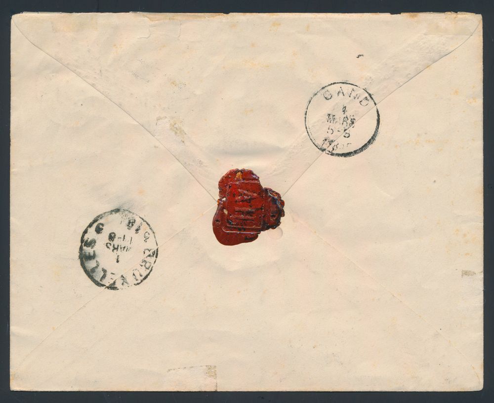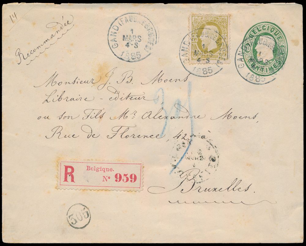 2727 PWST image1885 N° 4 "10c. green" large format rounded closing flap, registered on cover, from Gand (Faub. De Bruges), dd. 1 Mar 1885 with additional franking n° 32, to Bruxelles, vf(Image 1) (Image 2)