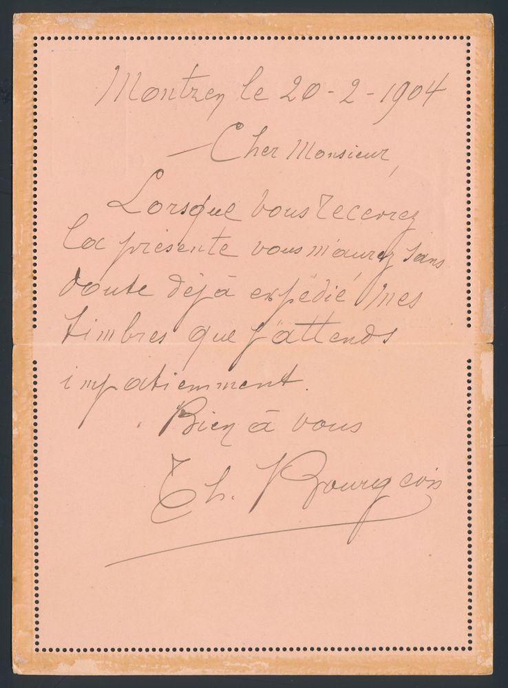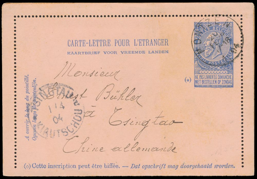 2732 PWST image1904 Card letter for foreign countries, N° 4 - "25c. blue on pink", from Montzen, dated 20 February 04, to Tsingtao (Chine Allemande), rare correspondence with China, vf.(Image 1) (Image 2)