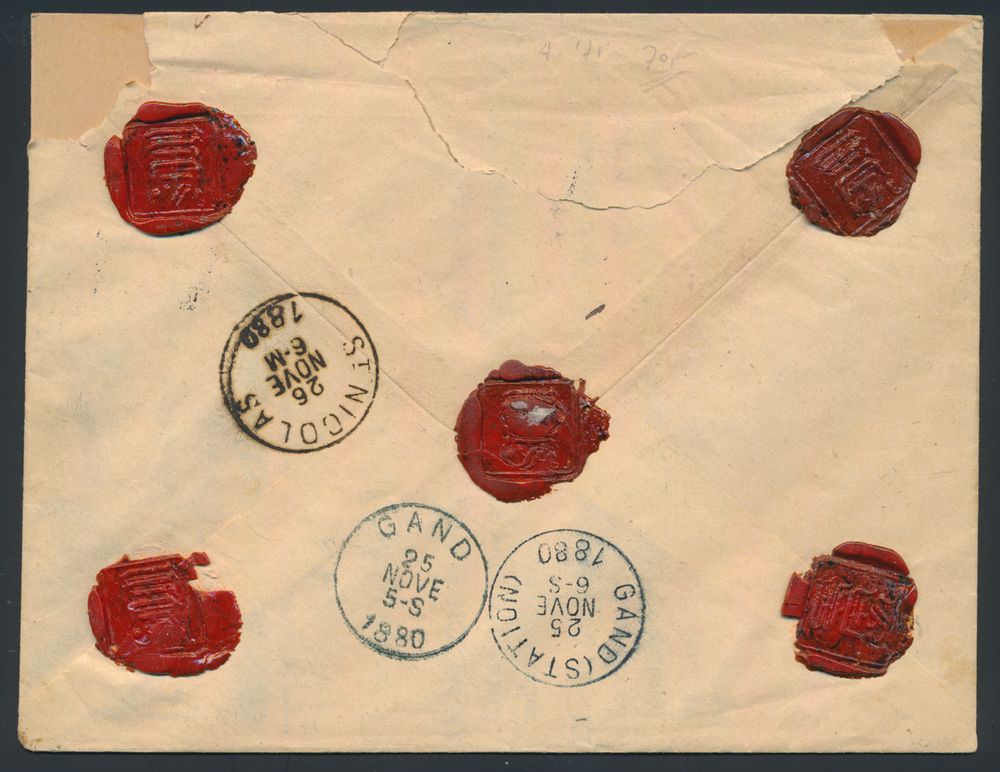 2774 image1880 N° 31 and 32, insured letter (envelope), from Gand(St Sauveur), dd. 25 November 1880 to St.-.Nicolas (arrival postmark Gand station) and Gand, both in blue and St. Nicolas dd. 26 November 1880), manuscript "Four hundred and fifty francs - 450 francs" on front, "ASSURÉ" in box black, on back required minimum of 5 wax stamps, service order dated 1 November 1879, Charge Fee up to 15 grams "10c.", Charge Fee is "10c. and insurance fee is "25c.", together "45c.", vf/f(Image 1) (Image 2)