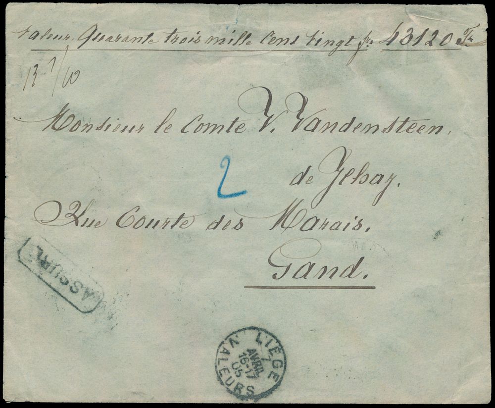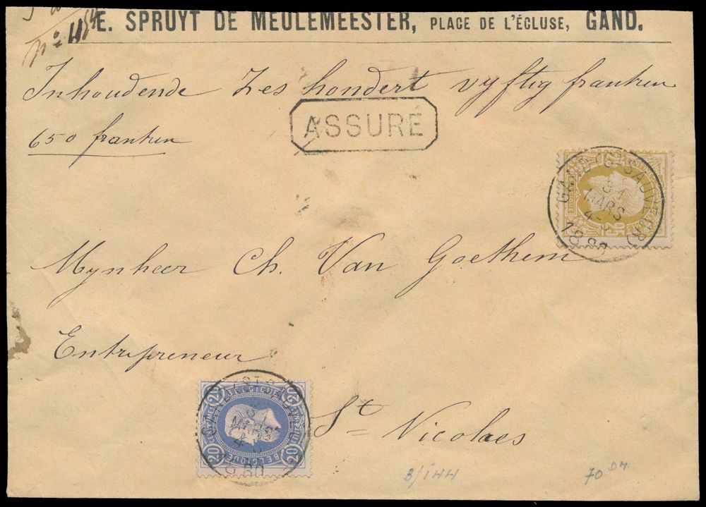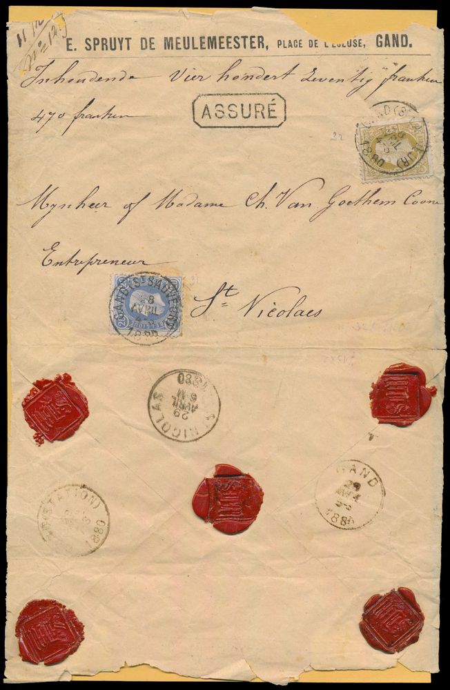 2775 image1880 N° 31 and 32, insured letter (envelope), from Gand(St Sauveur), dd. 28 April 1880 to St.-.Nicolas (arrival postmark Gand Station), Gand and St. Nicolas dated 29 April 1880), manuscript "Containing Four hundred and seventy francs - 470 francs" on the front, "ASSURÉ" in box black, on the back required minimum of 5 wax stamps, service order dated 1 November 1879, Charge Fee up to 15 grams "10c.", Charge Fee is "10c." and Insurance Fee is "25c.", together "45c.", vf/f(Image 1) (All Images)