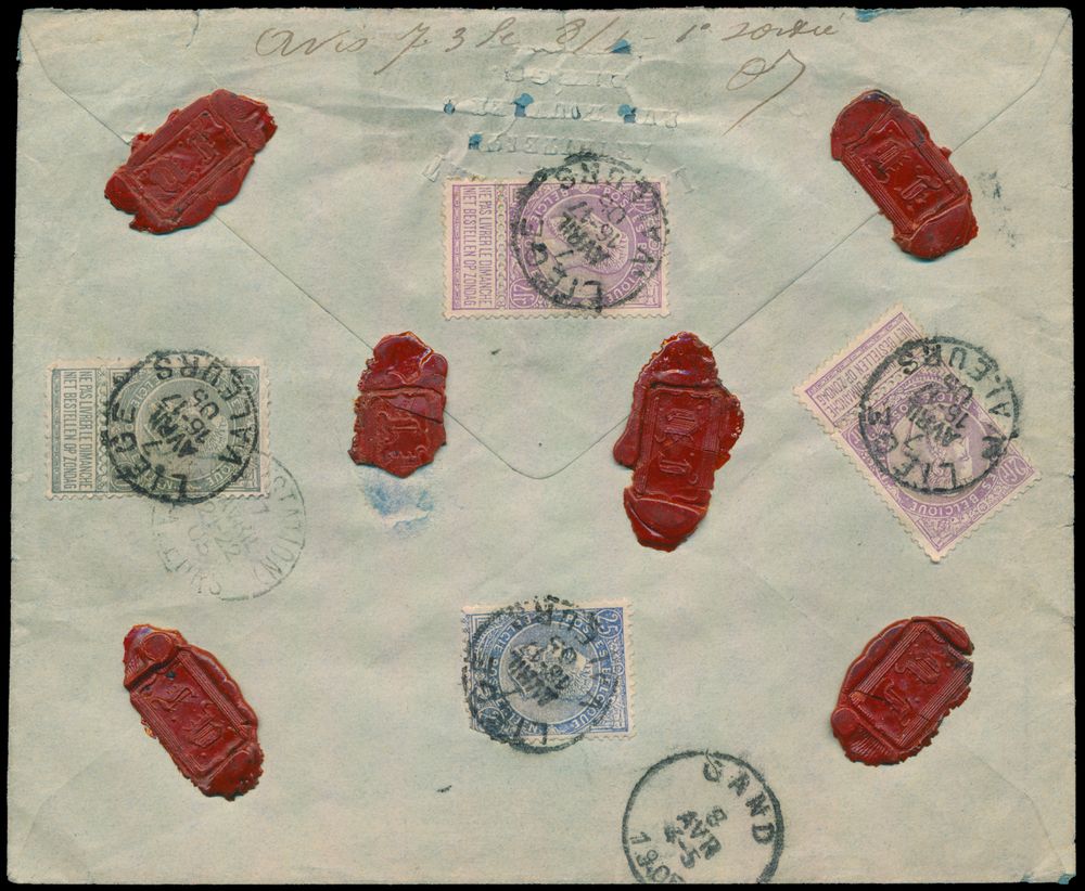 2778 image1905 N° 60, 62 and 67 (2x), on insured letter for "valeur quarante trois mille cents vingt - 43,120fr.", registered from Liège, dated 7 April 05, to Gand, "ASSURÉ" in box black and red wax seals (5 pieces) on reverse, total postage is "4.75fr.", wax seal "10c.", insured letter "25c." and insurance fee "4.40fr." (10c. per 1,000fr.), vf.(Image 1) (Image 2)