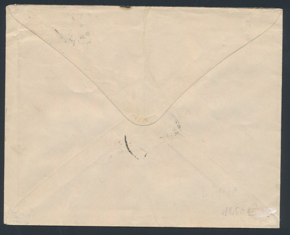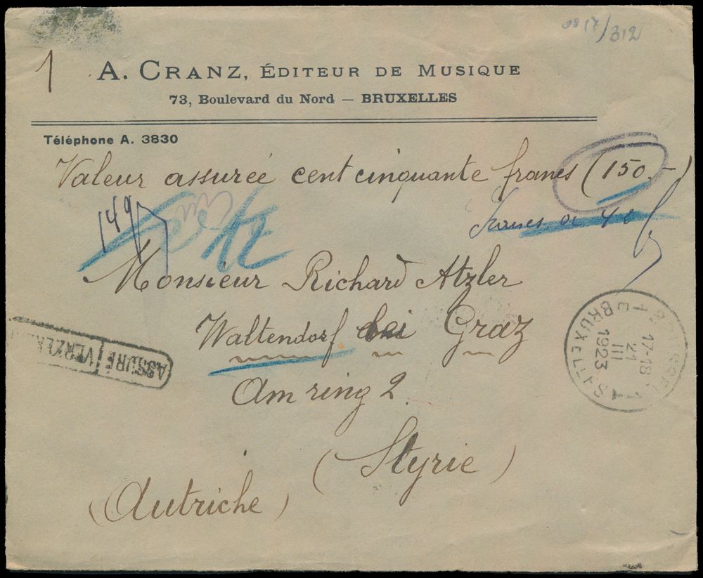 2779 image1923 N° 202 and 212 on insured letter, from Bruxelles, dated 21 III 1923, for "150fr.", to Waltendorf bei Graz (Styrie - Autrice), with receipt mark Karlsruhe, back has the 5 wax seals, postage is 50 cents, insured letter "50c." and insurance fee (overland) "5c." per 300 postage value (Total: 1.05fr.), but the letter is franked "1.15fr.", vf.(Image 1) (Image 2)