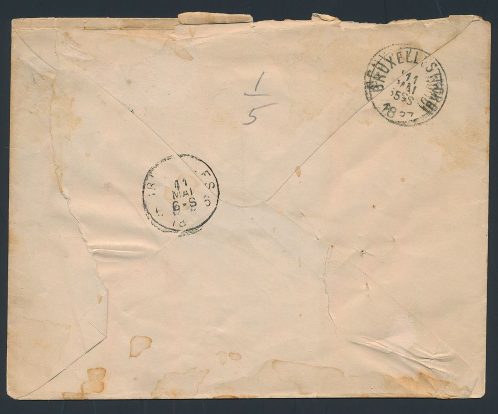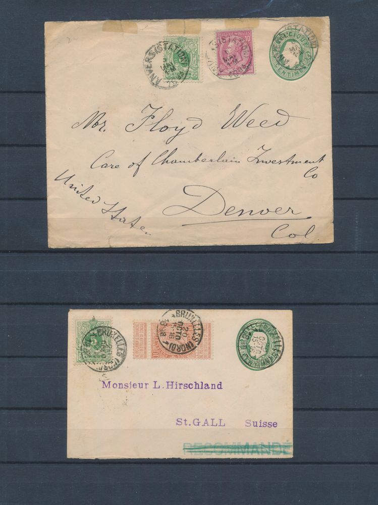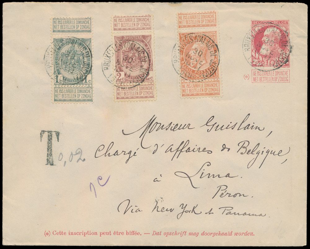 2764 PWST imageLetter covers - N° 7, "10c carmine on white - inside grey", with additional franking of N° 53, 55 and 57, cancelled with Bruxelles (Palais de Justice), to Lima (Peru), additional "T" stamp of tax for "0.02", shipment was sent via New York and Panama (manuscript), vf(Image 1) (Image 2)