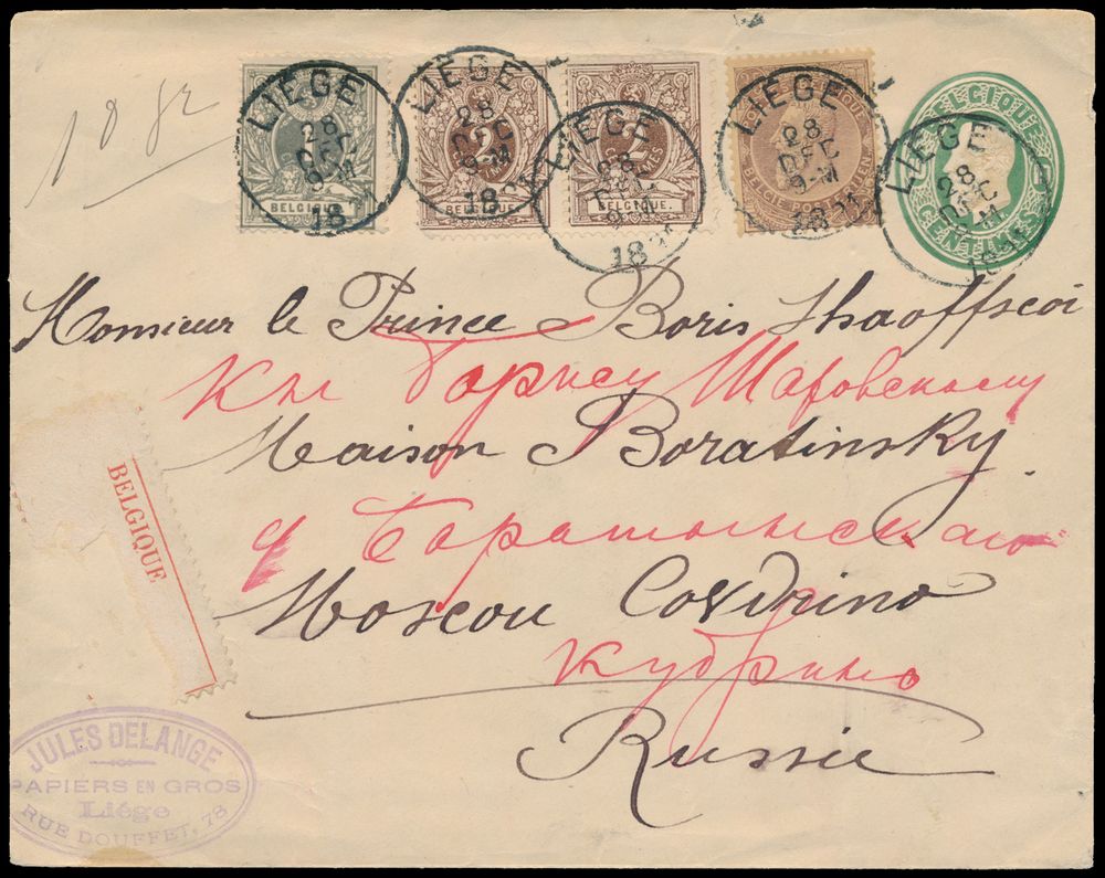 2766 PWST image1891 Letter envelope, "10c. green", large format (N° 4), with additional franking N° 43, 44 (2x) and 49, on registered shipment (different label), from Liège, dated 28 December 1891, to Moscow (Russia), sent via Kubrino, manuscript of "10gr.", vf(Image 1) (Image 2)
