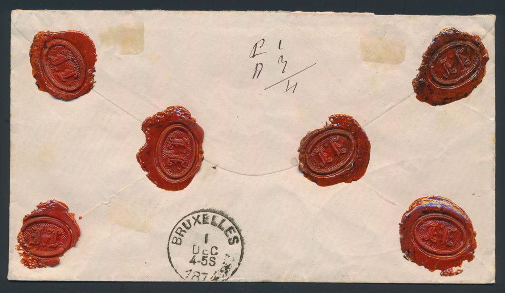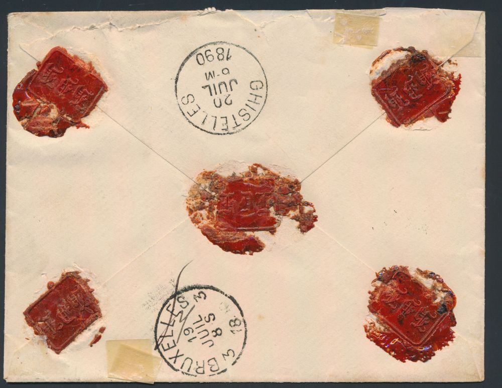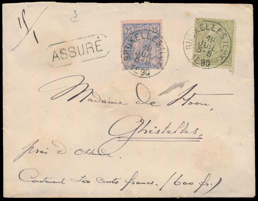 2777 image1890 N° 47 and N° 48, on insured letter for 'Contenant sixc. francs / 600 fr.', from Bruxelles(LUX.) to Ghistelles, dated 19 July 1890. With red wax seals (5 items). Total franking is 45c.. Receipt mark on reverse of Bruxelles 3 and Ghistelles. Charge : 10c., registration fee 25c., Insurance fee 10c. (per 1000 francs : 10c.), total of 45c., vf.(Image 1) (Image 2)