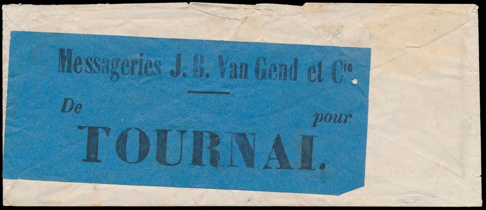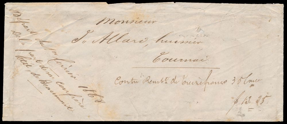 2771 image1868 Letter envelope, sent from Beaumont, dated 1 fev. 1868 (manuscript), to Tournai, with manuscript "contre Remb. de treize francs 35 Cmes", on the back, beautiful blue vignette of "Messageries J.B. Van Gend et Co, Tournai", vf(Image 1) (Image 2)