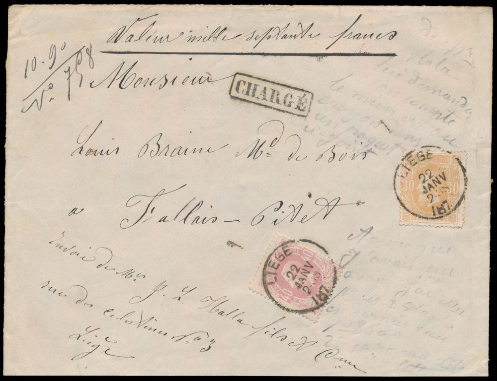 2773 imageN° 33 "30c. ochre red" and 34 "40c. pink", insured letter (front only), from Liège (EC), dated 22 January 187? to Fallais-Pitet, manuscript "10.90 - N° 798" and "Valeur mille septante francs" on front, "Charge" in frame black, insured letter up to 15gr. "10c.", insurance duty up to 2,000fr. is "60c.", together "70c.", vf(Image 1) (All Images)