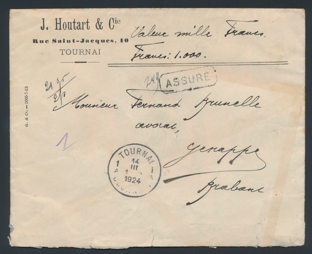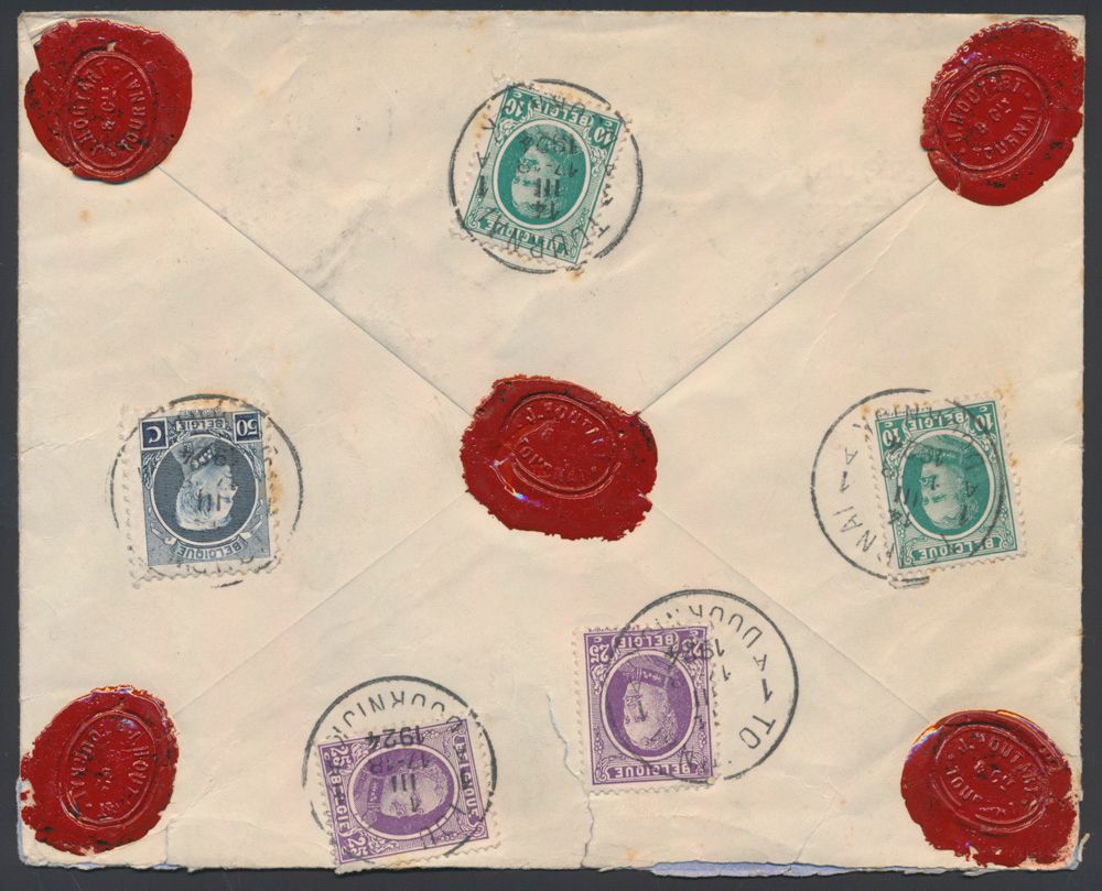 2780 image1924 N° 194 (2x), 198 (2x) and 211 on insured letter, from Tournay 1A, dated 14 III 1924, for "1000fr.", to Genappe, back has the 5 wax seals, vf(Image 1) (Image 2)
