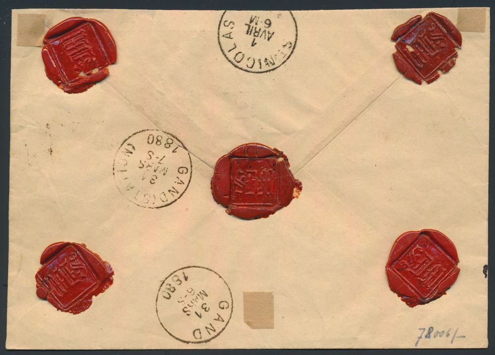 2776 image1880 N° 31 and N° 32, on insured letter for 'Containing six hundred and fifty francs - 650 francs', from Gand(S-Sauveur) to Sint Niklaas, dated 31 March 1880. With red wax seals (5 items). Total franking is 45c.. Multiple receipt mark on reverse of Gand, Gand(Station) and St.Nicolas. Charge : 10c., registration fee 25c., Insurance fee 10c. (per 1000 francs : 10c.), total of 45c., vf.(Image 1) (Image 2)