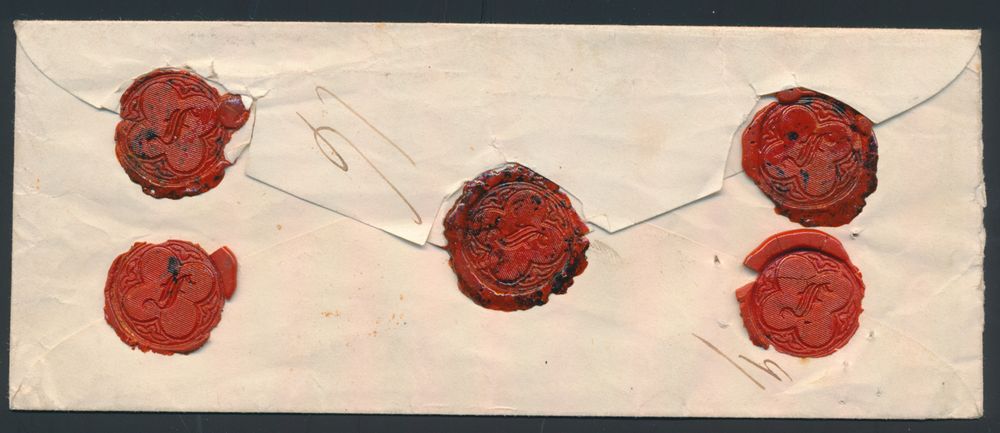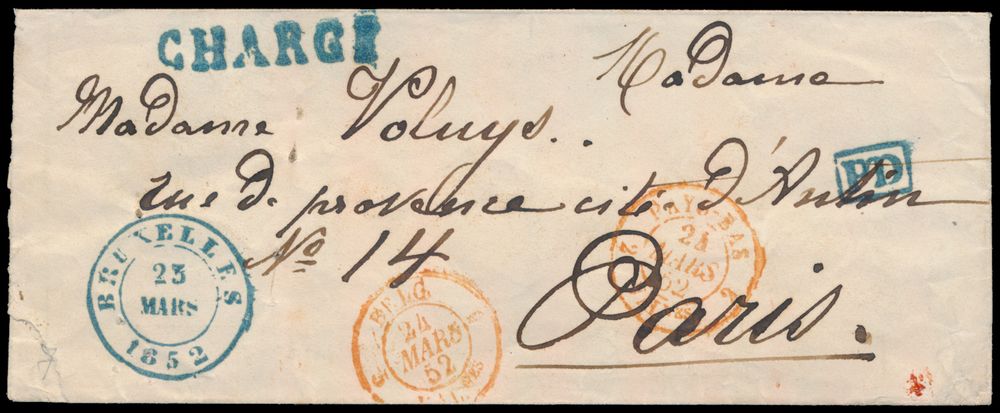 2770 image1852 Letter without contents, from Brussels, dated 23 March 1852, to Paris (France), beautiful "CHARGE" stamp in blue, "PD" in box blue, on back 5 wax pictorial stamps and manuscripts of charge 9 and 16, vf(Image 1) (Image 2)