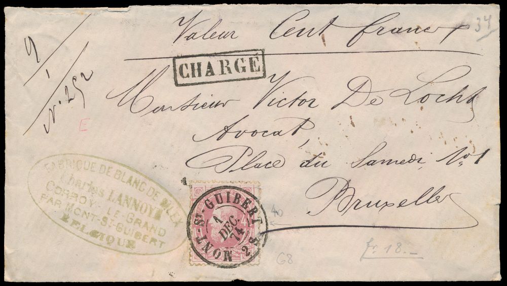 2772 image1874 N° 34 "40c. pink", on letter envelope, from Mont-St.-Guibert, Dca cancelled, dated 1 December 74, to Bruxelles, insured letter of "Valeur cent francs", with "Charge" in frame black, nice manuscript "9/1/N.292" (9gr. - first weight class - registration number) front, 6 pocket stamps on reverse, charge to 15 grams "10c.", "Charge Fee 20 cents" and "Insurance Fee 10 cents", together "40c.", vf(Image 1) (Image 2)