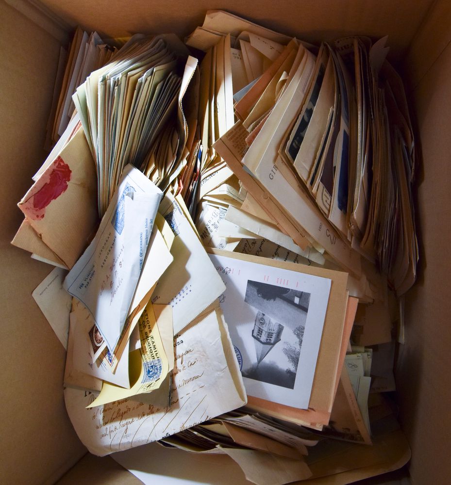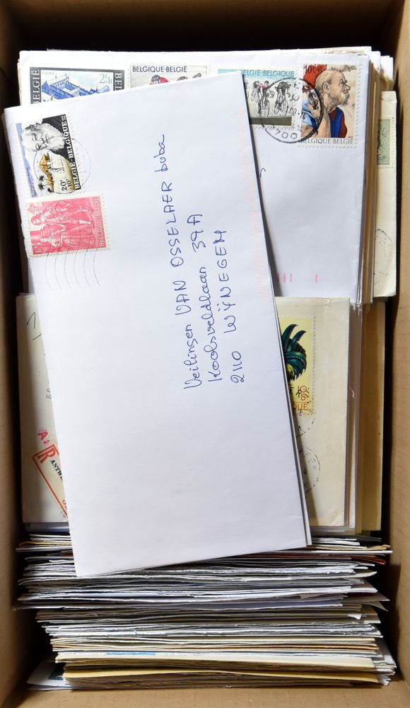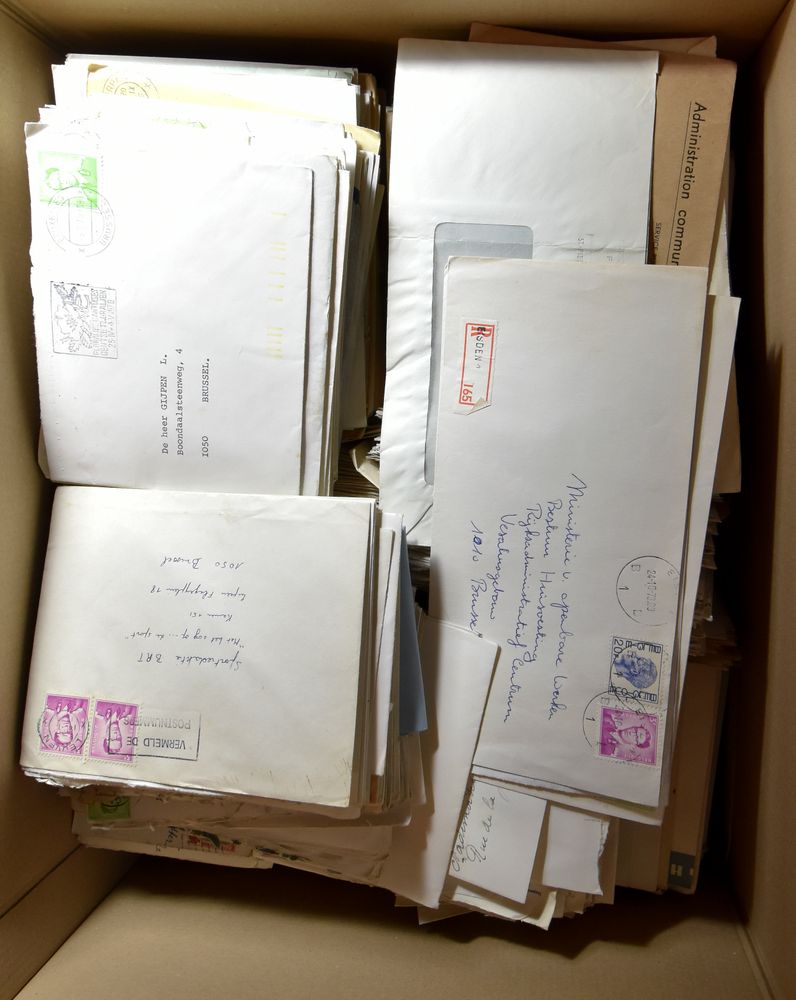 Baudouin glasses, large box with 100s of postal items, wide