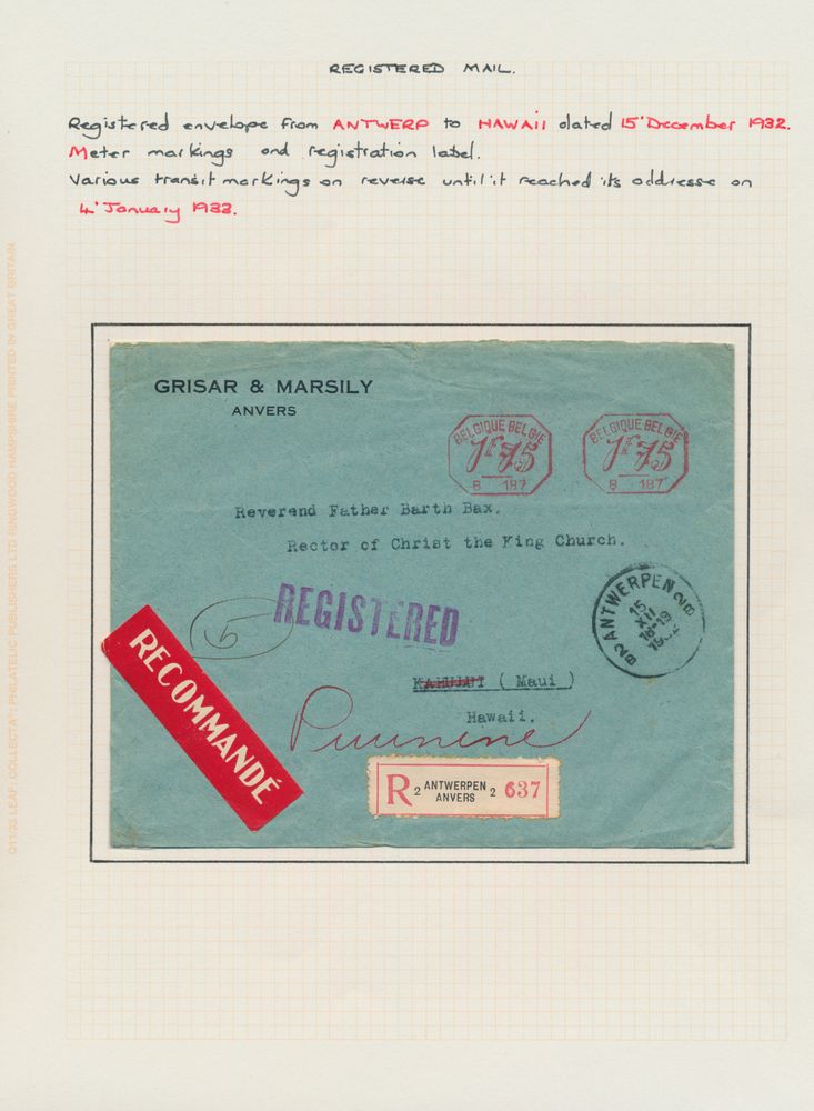 1932, to Hawaii, mechanical franking twice of "1fr. 75c. "(B187), cancellation purple "Registered" and sticker red "Recommandé", multiple cancelled on reverse, reached Hawaii in January 1933, vf.(Image 1)
