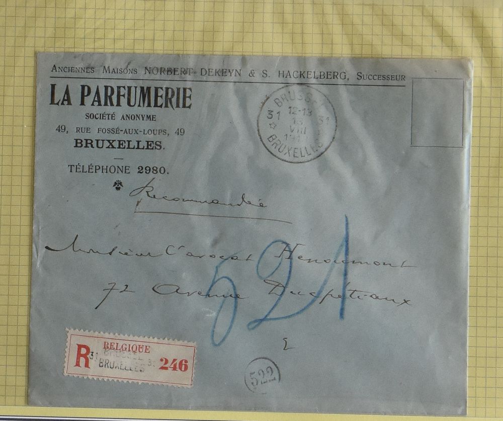 violet brown", on registered letter, from Bruxelles 1 (bilingual cancellation), dated 3 January 1936, to East Orange N.Y. (U.S.A.), multiple stamps on front, purple in frame 3 lines "Supposed liable to / United States / Customs Duties", pair in frame