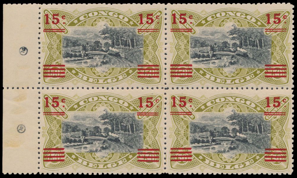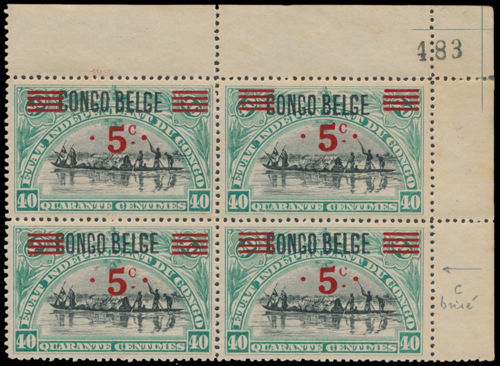 3254 nh imageN° 85A "5c. on 40c." with overprint "CONGO BELGE" in block of 4, position 10 has the broken "C" variety, certificate Tavano, vf (OBP €1,000)(Image 1) (Image 2)