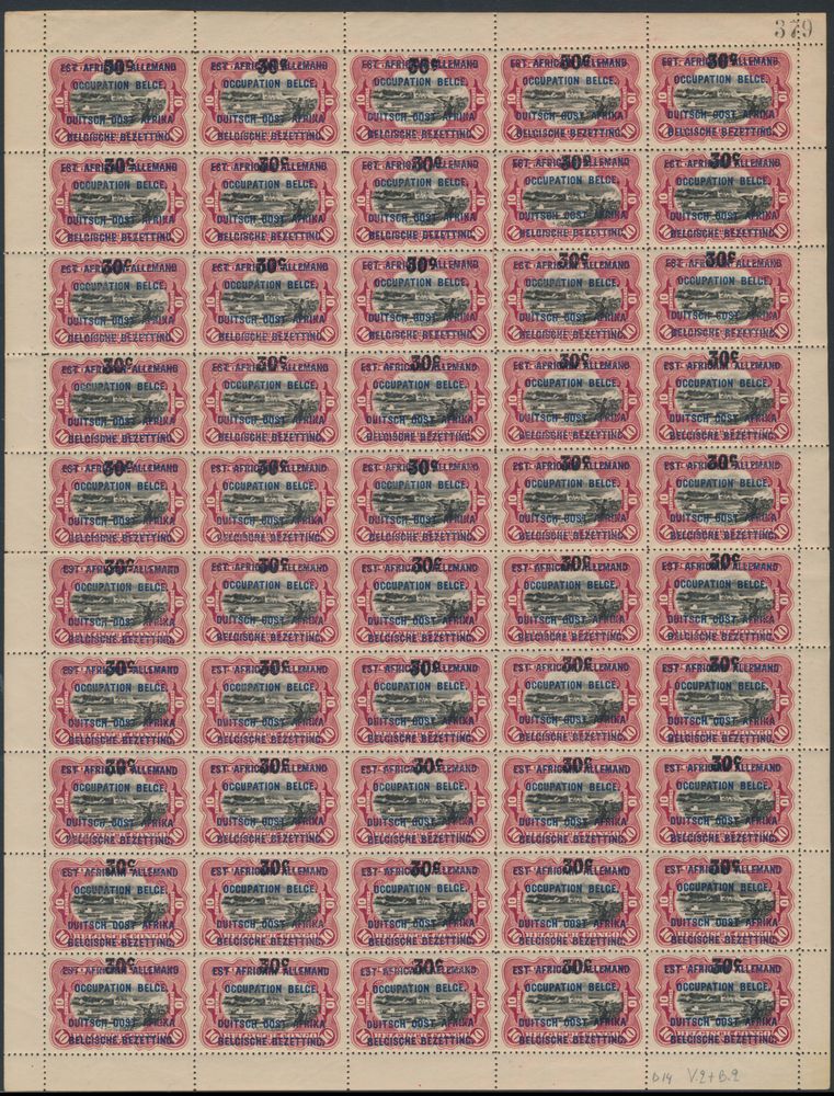 3249 nh imageTwo complete sheets of "10c. carmine" perforated 14, one with overprint "DE MALINES" (N° 98) and the other with overprint of occupation of German East Africa (Ruanda Urundi N° 48), both sheets with combination of plates V.2 + B.2, vf (OBP €100)(Image 1) (Image 2)