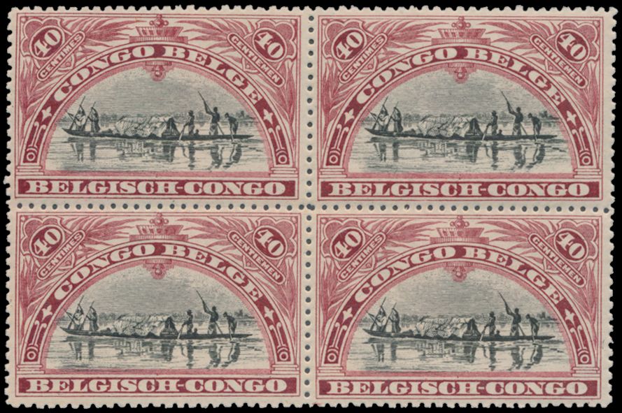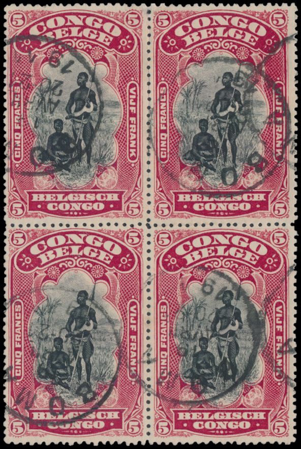 3245 0 imageN° 62 "5fr. carmine Mols Bilingual 1910 issue", used block of 4, cancelled "Boma 19 AVRIL 1911", perf 15, scarce, vf(Image 1) (All Images)