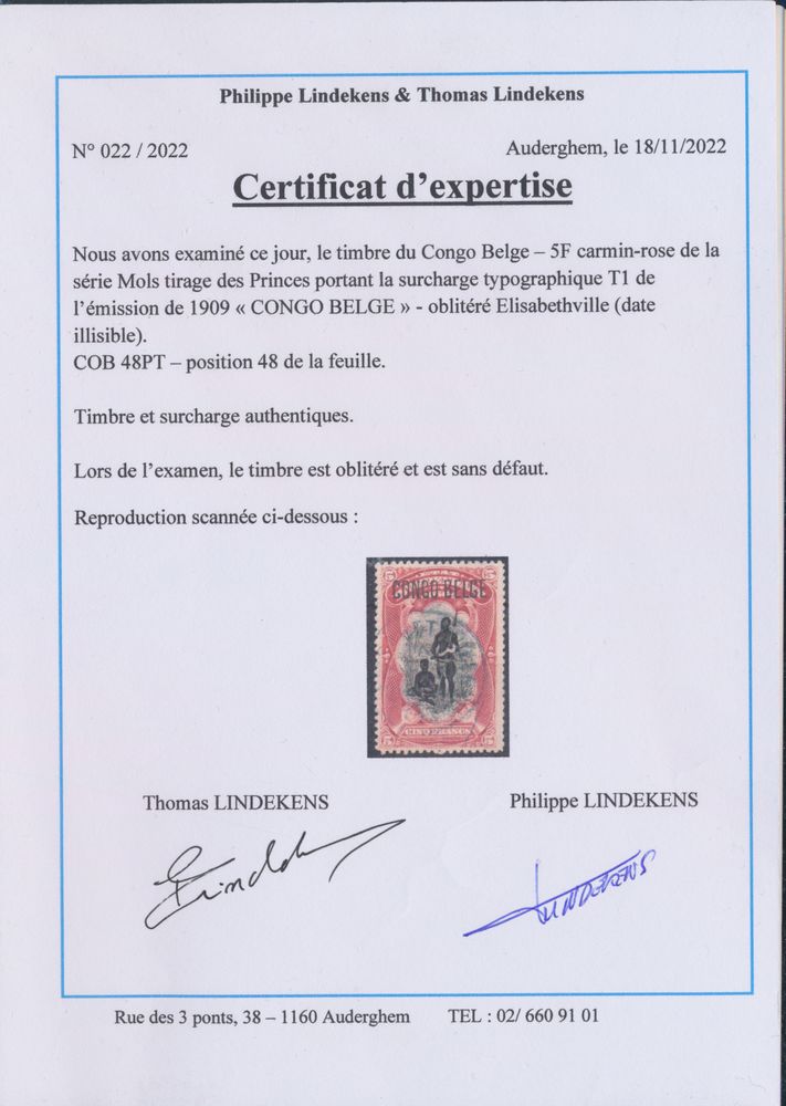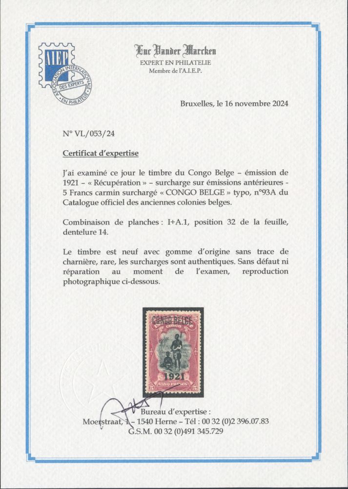 3260 nh imageN° 93A "1921 on 5fr. carmine" with typo overprint "CONGO BELGE", certificate Luc Vander Marcken, vf (OBP €525)(Image 1) (Image 2)