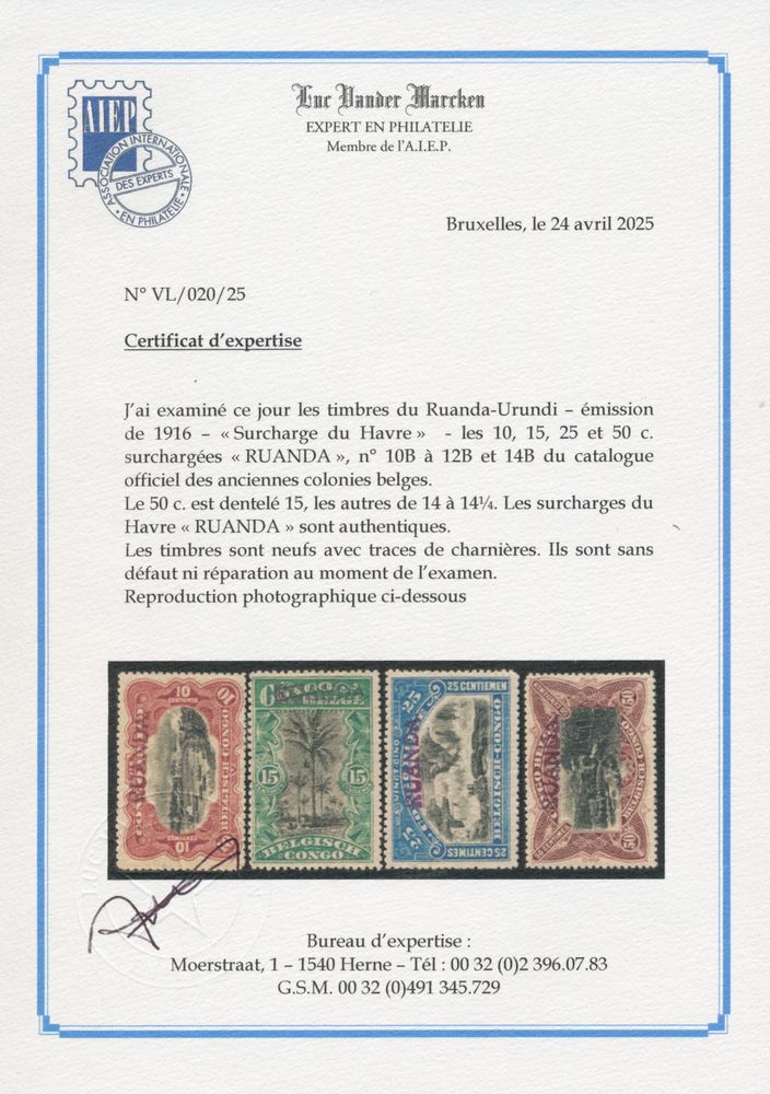 3347 og imageN° 10 B/12 B and 14 B, with overprint 'Ruanda' from Le Havre, 50 cent. perforation 15, the other 14, with certificate, vf (OBP € 444)(Image 1) (Image 2) (Image 3)