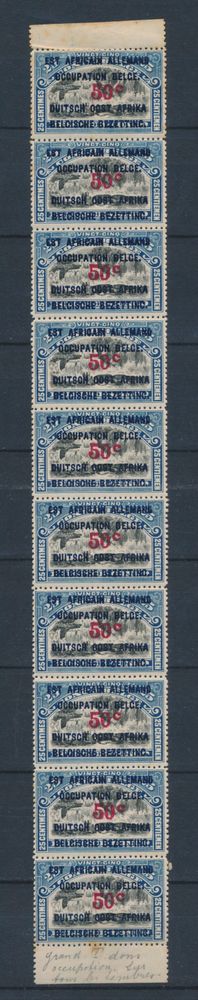 3358 nh/og imageN° 49 "50c. on 25c. blue", vertical wrapper of 10 items (8 ** + 2 *) all with large "T" variety in overprint, plate III 1 + B, positions 2, 7, 12, 17, 22, 27, 32, 37, 42, and 47, perf 14, rare, to be checked(Image 1) (All Images)