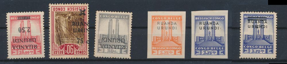 3357 og/❒ image1941/1942, group of 6 stamps, 119-Cu1 "75c on 90c red" with inverted surcharge, 120-Cu "2,50fr on 10fr red" with inverted surcharge, 121-cu "10c grey" with inverted overprint, 122/123 unperforated and 125-cu "2,50fr on 2,75fr" blue with inverted surcharge, all hinged and with rust but scarce to find, (COB 207€), to be checked(Image 1) (All Images)