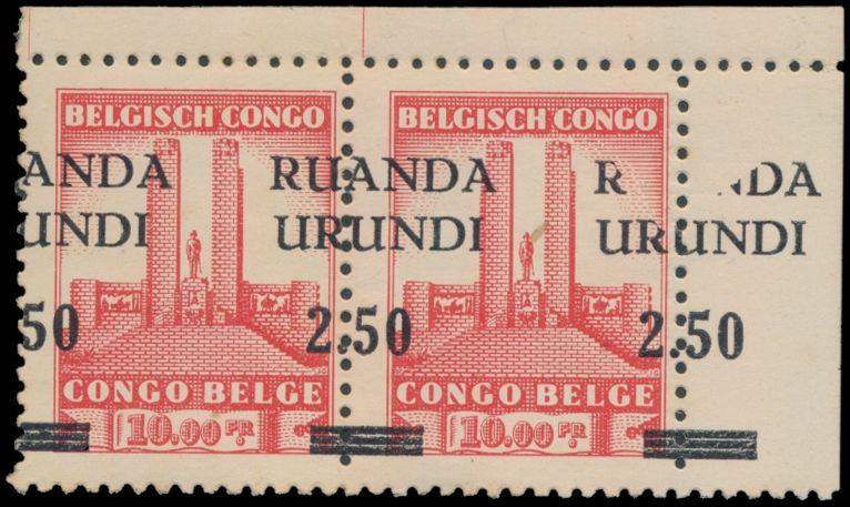 3354 nh/og imageN° 120cu "2,50 on 10fr red" in horizontal pair with corner of sheet, with spectacular curiosity, misplaced overprint "RUANDA URUNDI 2,50" ( A CHEVAL) and partial , some stains, but scarce, f/to be checked(Image 1) (All Images)
