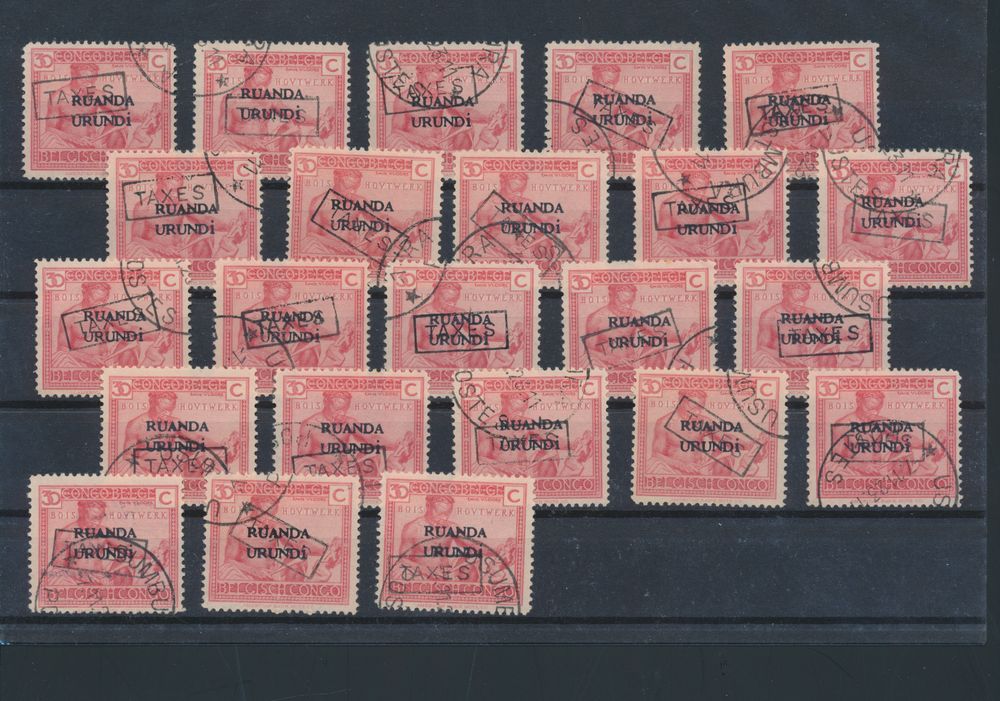 3356 0 image1923, group of 37 stamps of the Floors issue, all overprinted "TAXES" and cancelled in Usumbura, not listed on COB 3fr (11x), 75c (1x), 50c (2x) and 30c (23x), quality to be checked, vf/f/to be checked(Image 1) (Image 2)