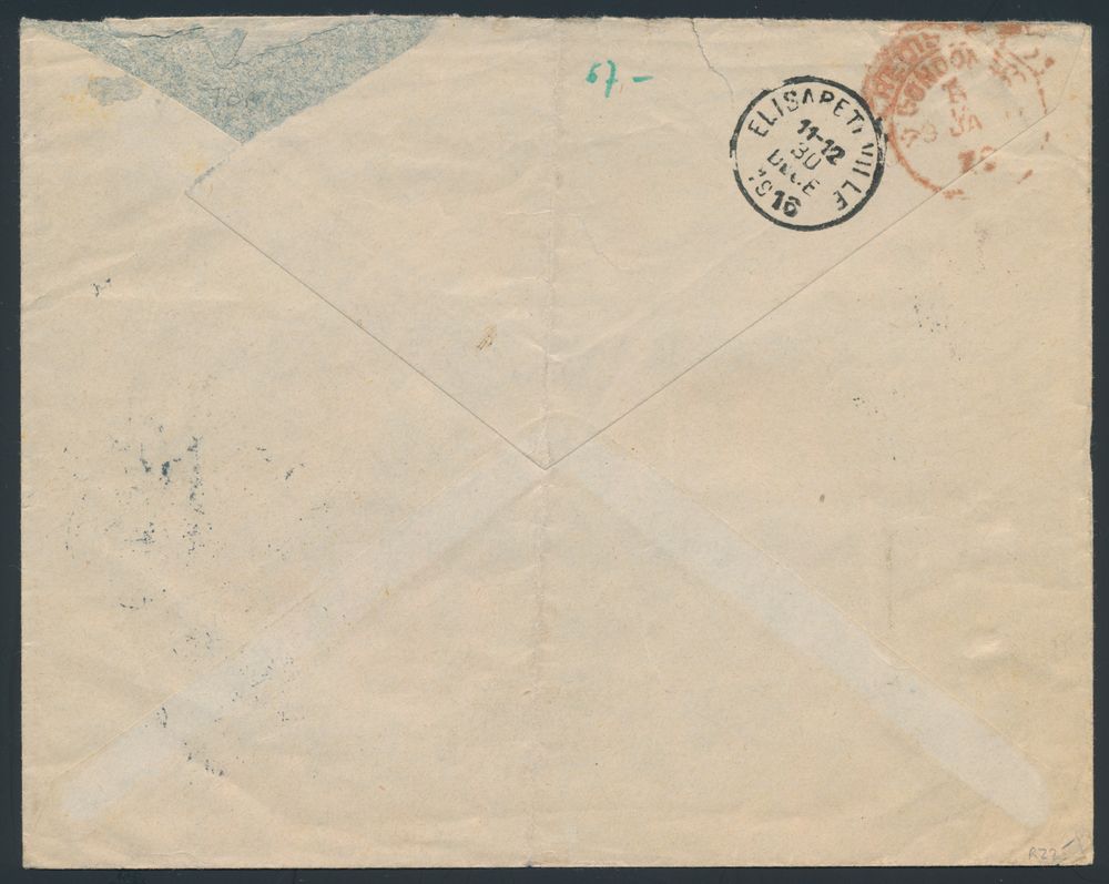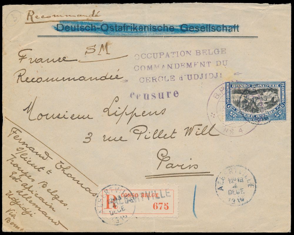 3352 image1916 N° 67 "25c. blue" on registered letter cancelled "BPCVPK n° 4 29 OCT 16" to Paris, German cover with 3-line letterhead "OCCUPATION BELGE COMMANDANT DU CERCLE D'UDJIJI" and "CENSORSHIP" griffs, transit marks Albertville, Elisabethville and London, fine condition, rare, vf.(Image 1) (Image 2)
